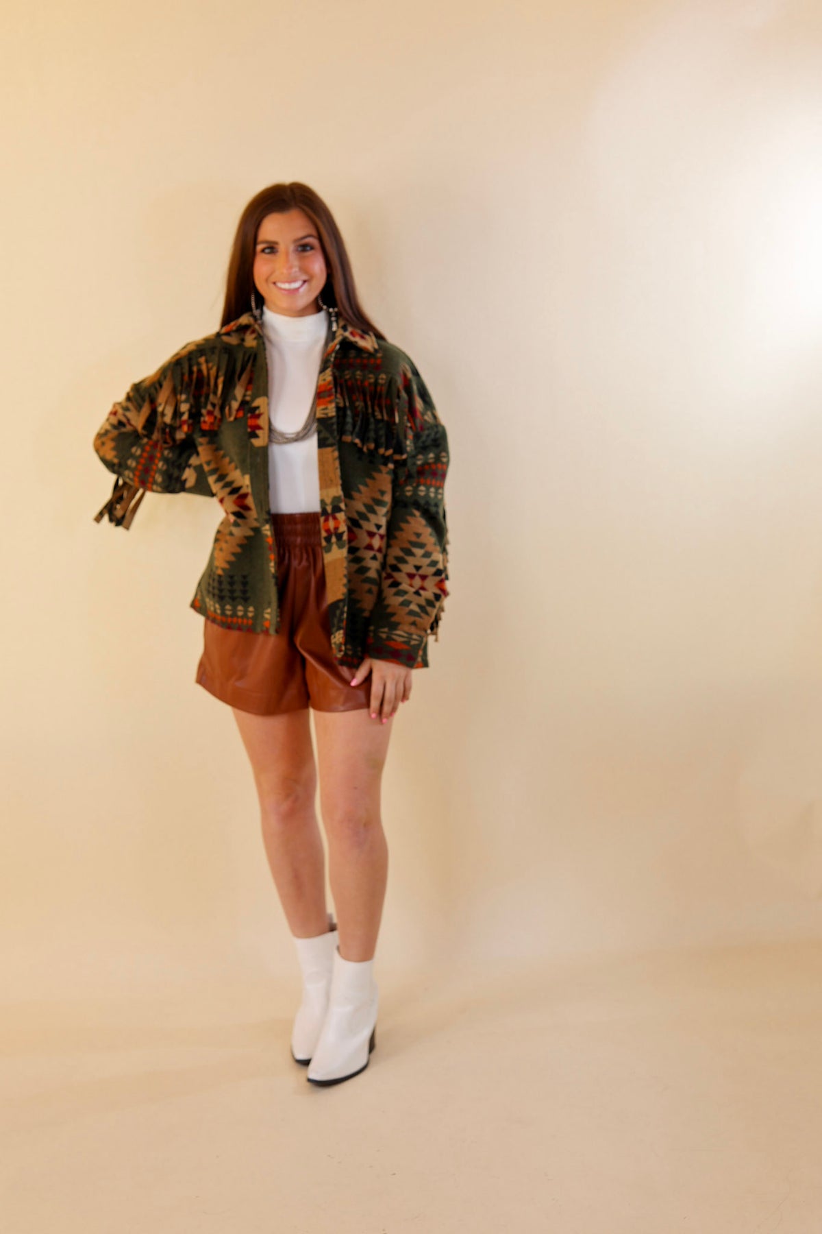 Take Over Aztec Print Button Up Jacket with Fringe in Olive Green