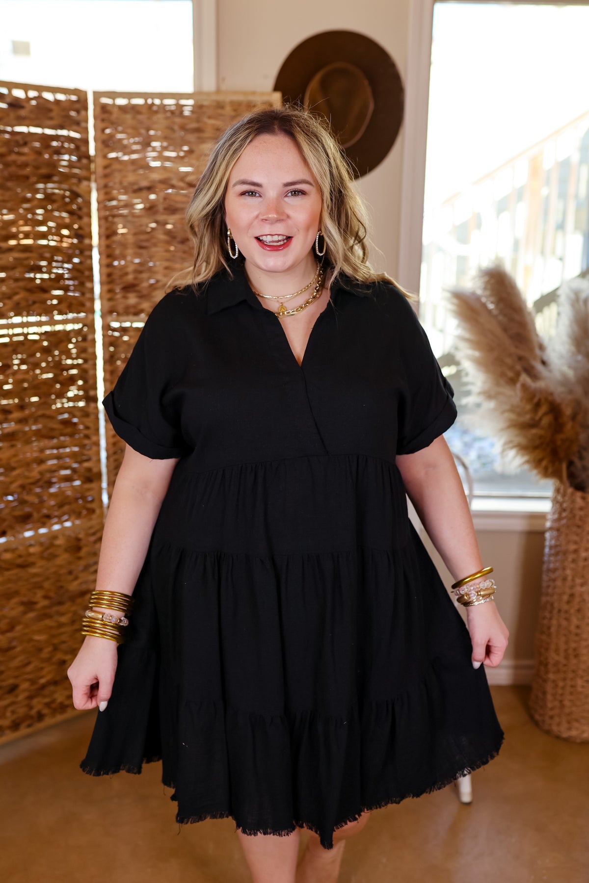 Last Chance Size Small | Taos Transitions Ruffle Tiered Collared Dress with Frayed Hem in Black