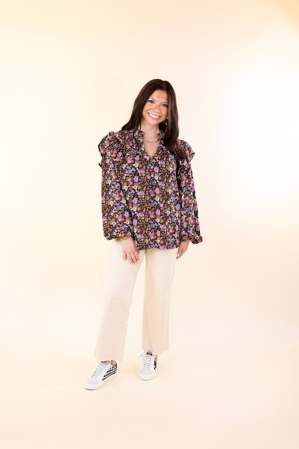 Never A Worry Floral Long Sleeve Pleated Detail Blouse in Black