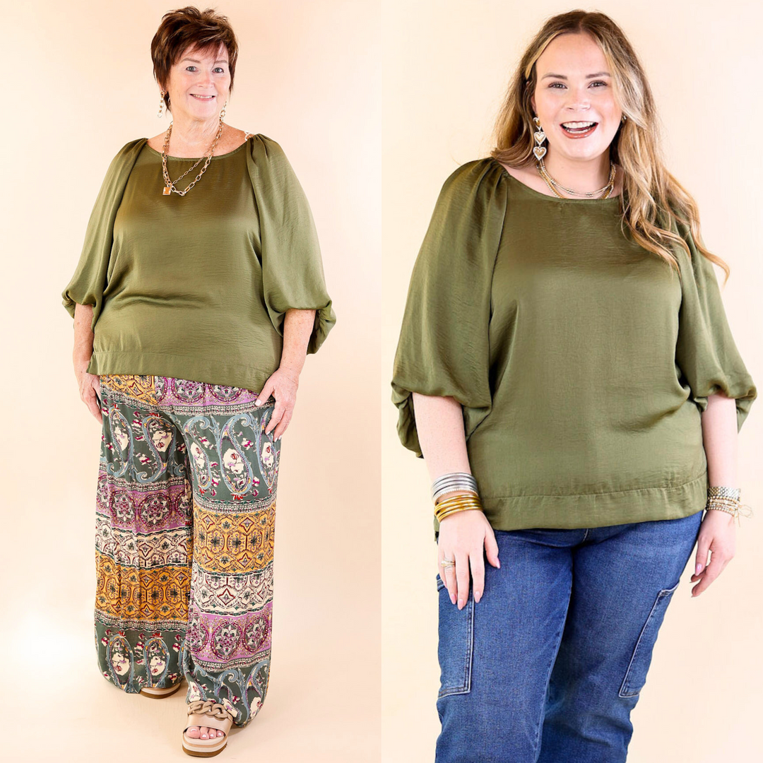 Flash A Smile Half Balloon Sleeve Satin Blouse in Olive Green