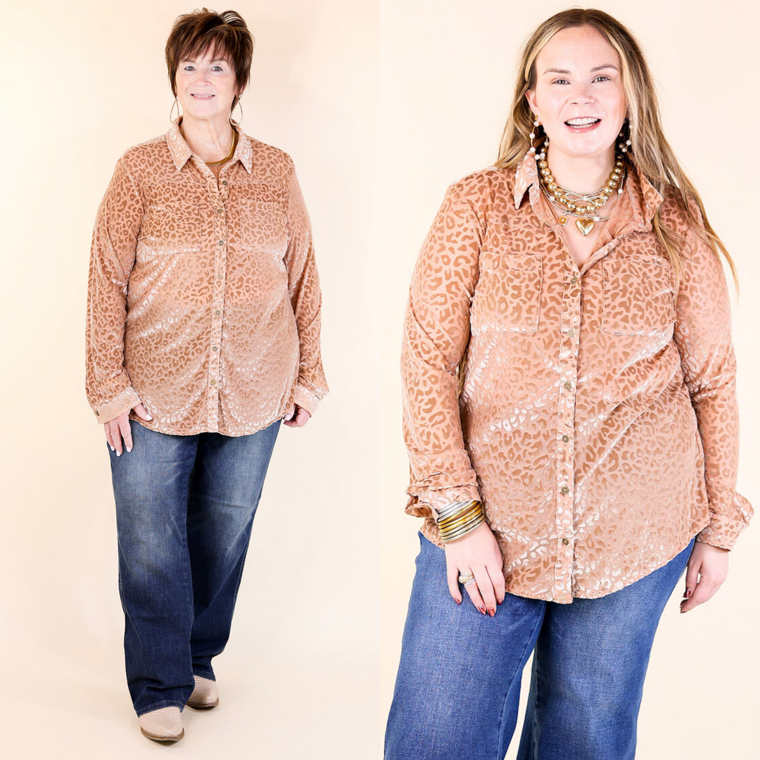 Candy Apple Evening Button Up Animal Print Velvet Long Sleeve Blouse in Champagne