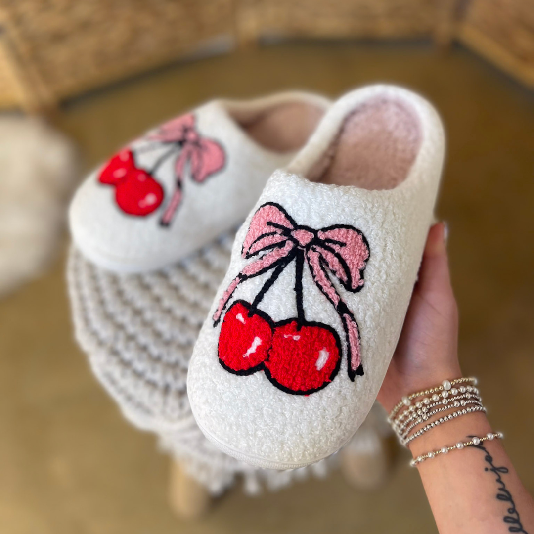 Barefoot Bliss Slide On Slippers in Ivory with Cherry and Bows
