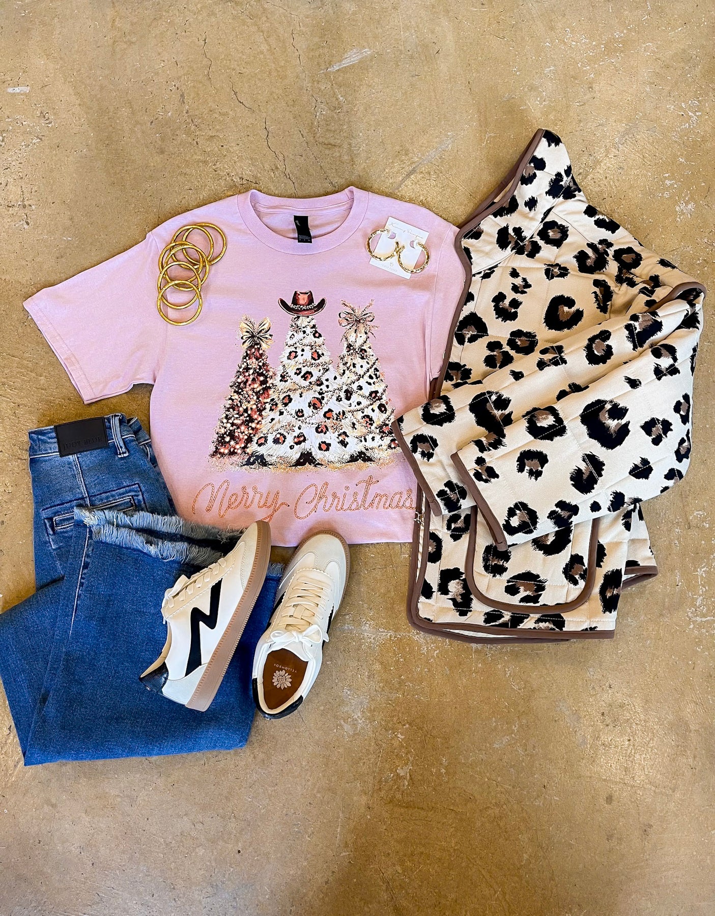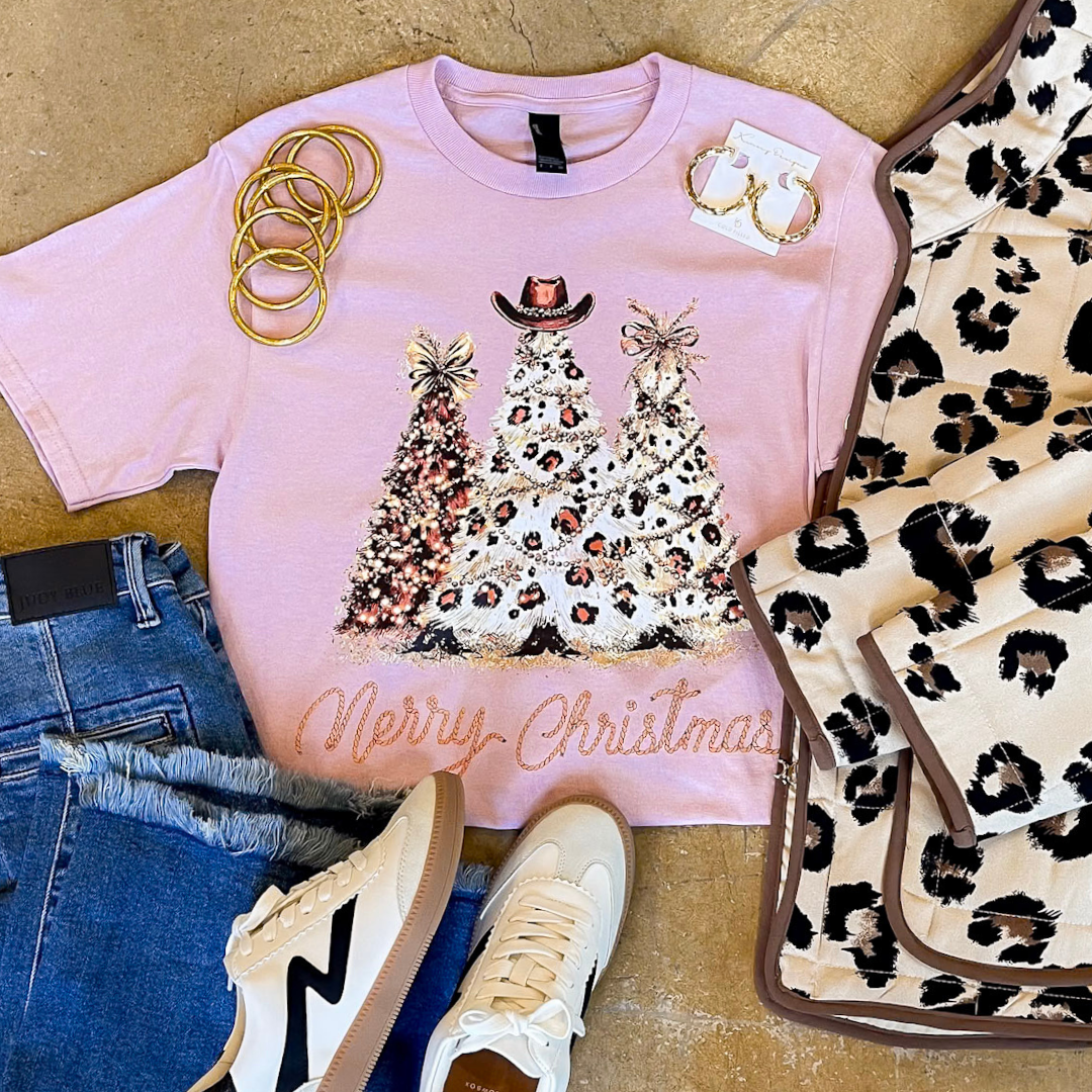 Say hello to festive fun with a western twist in our Howdy Holidays Graphic Tee! This playful pink tee brings Christmas cheer with a trio of leopard print Christmas trees topped off by a cowboy hat for that signature southern sass. Finished with bold “Merry Christmas” lettering across the front, it’s the perfect balance of festive and fun.