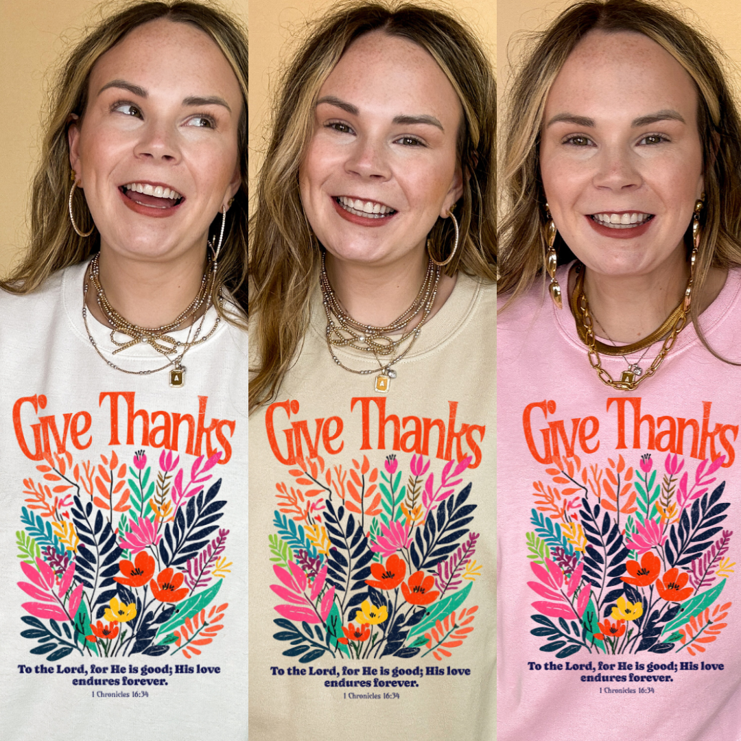 Online Exclusive | 1 Chronicles 16:34 Give Thanks Floral Fusion Graphic Sweatshirt in Multiple Color Options