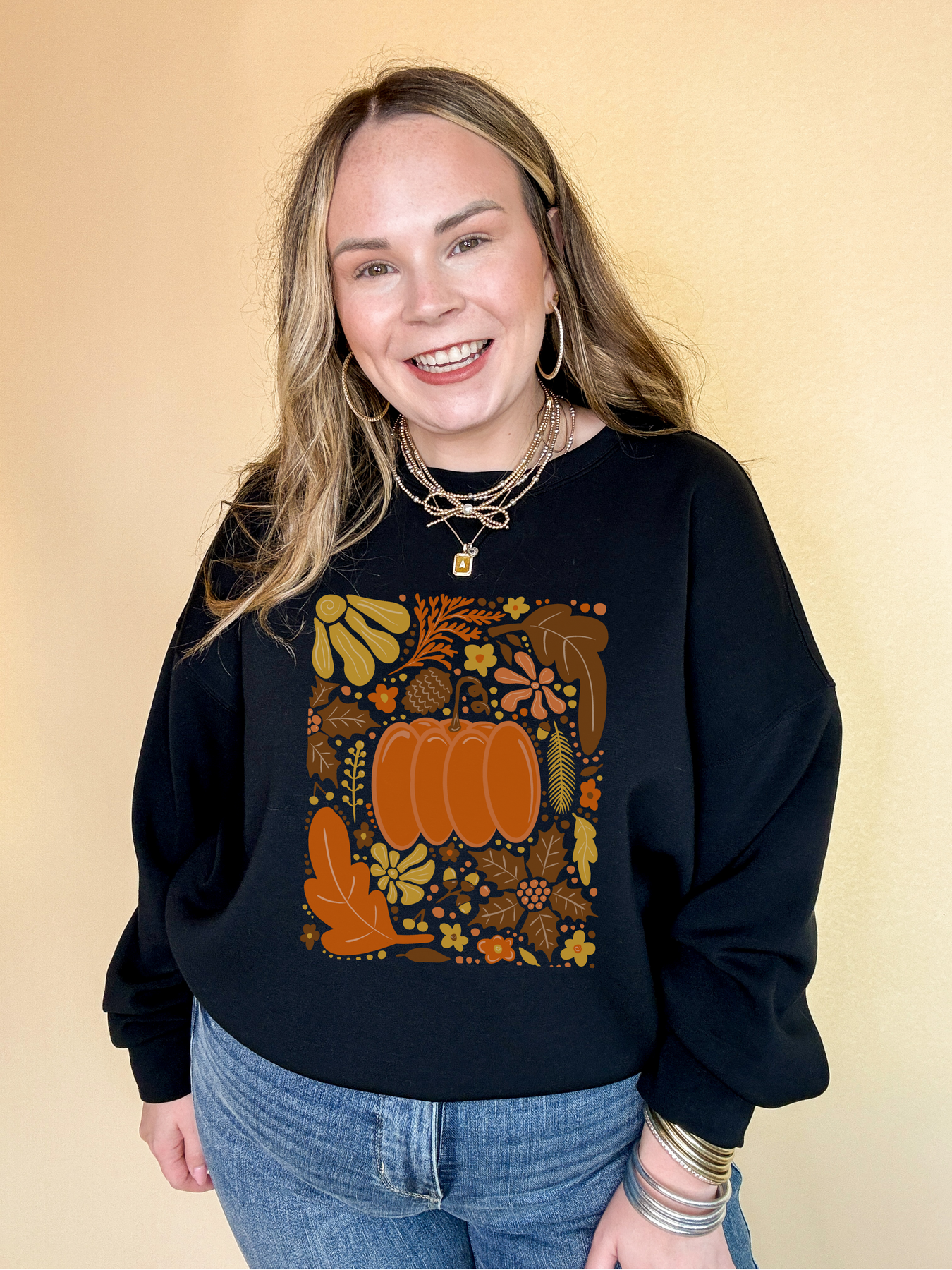 Online Exclusive | Fall Mania Graphic Sweatshirt with Hand drawn Pumpkin and leaves in Multiple Color Options