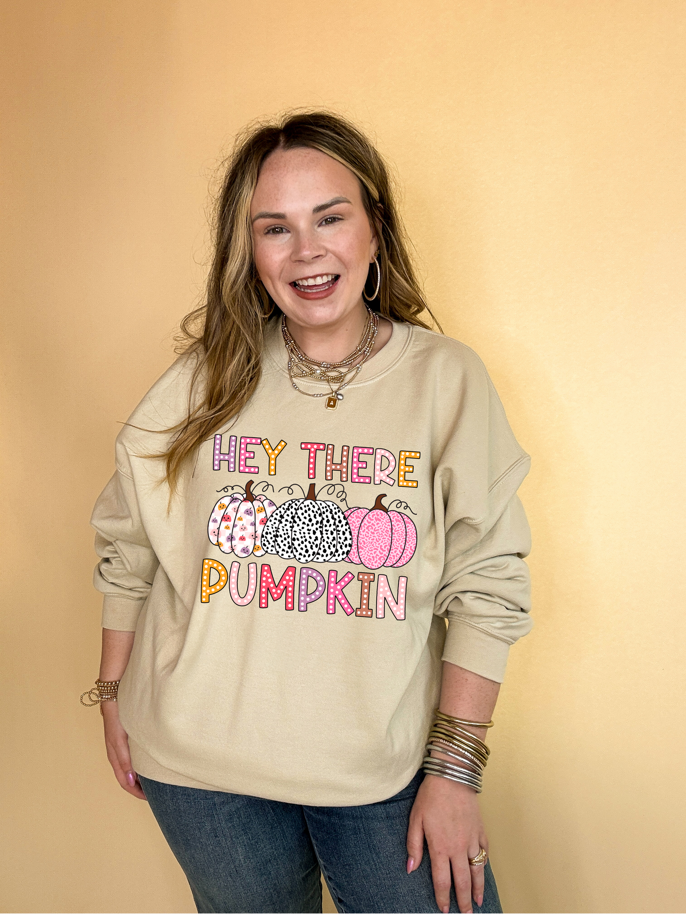 Hey There Pumpkin Graphic sweatshirt features a playful mix of colorful letters, each adorned with white dots. Accompanying the text are three charming pumpkins: white with bold black dots, another styled in a fun pink cheetah pattern, and a third decorated with an array of mini pumpkins. This delightful design captures the essence of autumn with a fun and stylish twist!