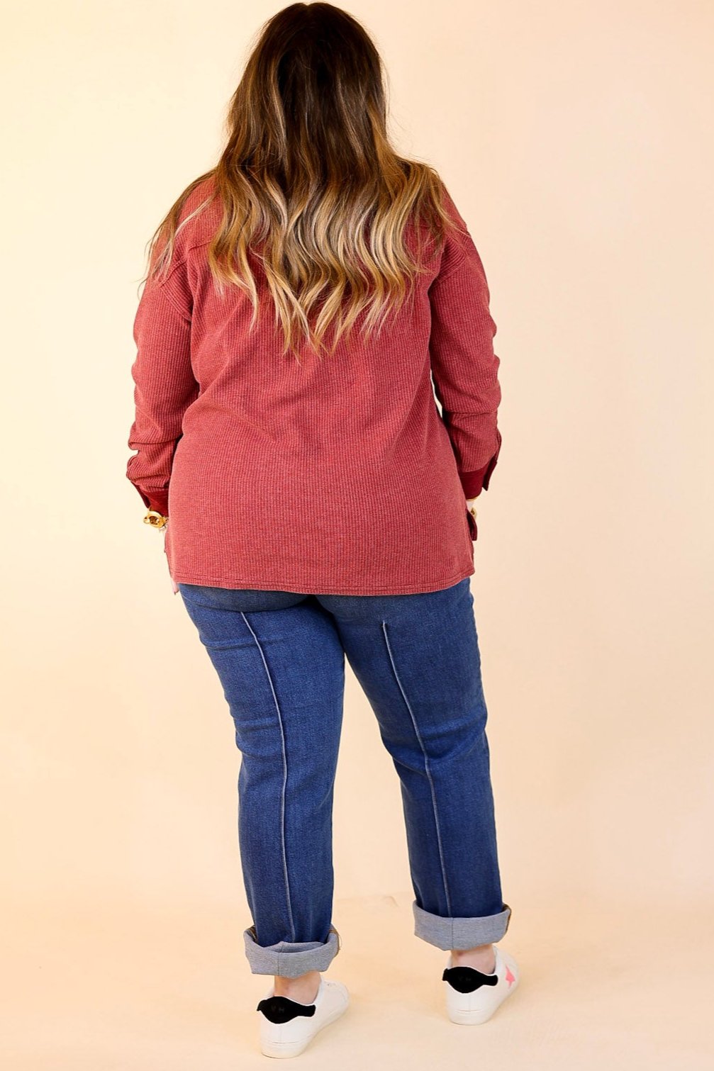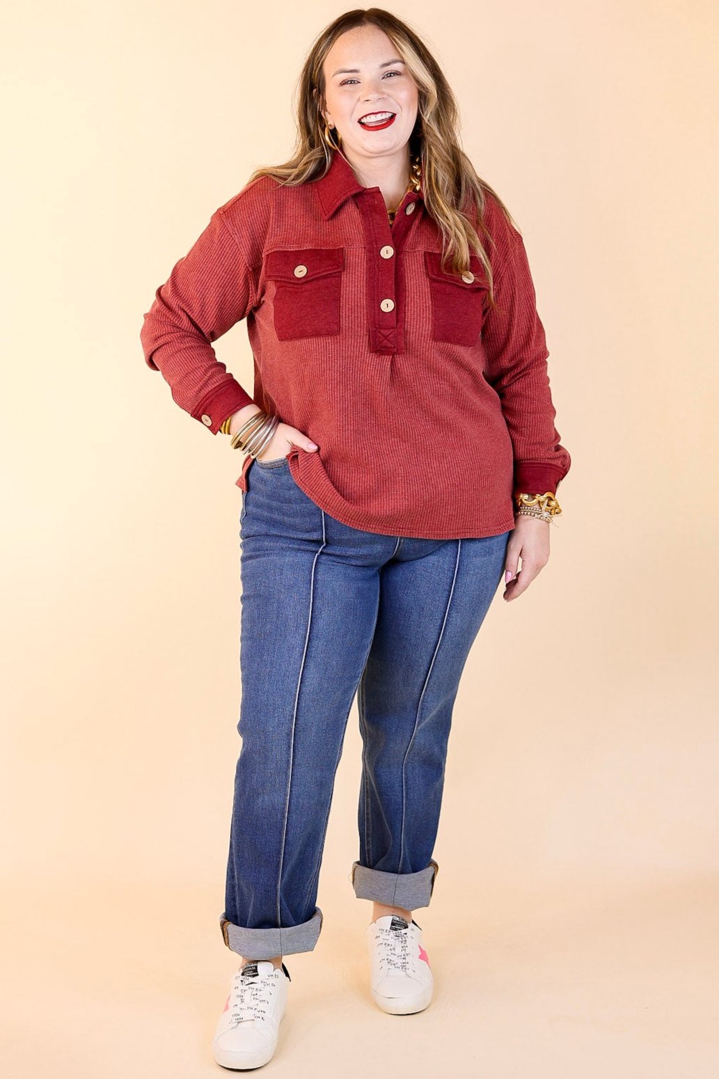 This top definitely passes the vibe check for comfortable style! It will be a cozy welcome into the chilly weather! It includes a waffle knit body, front pockets, a quarter button up front with a collared neckline, long sleeves, and so much comfort!