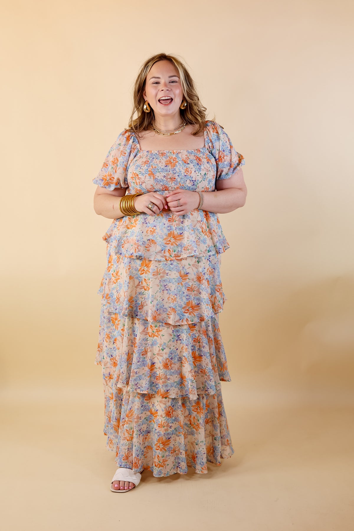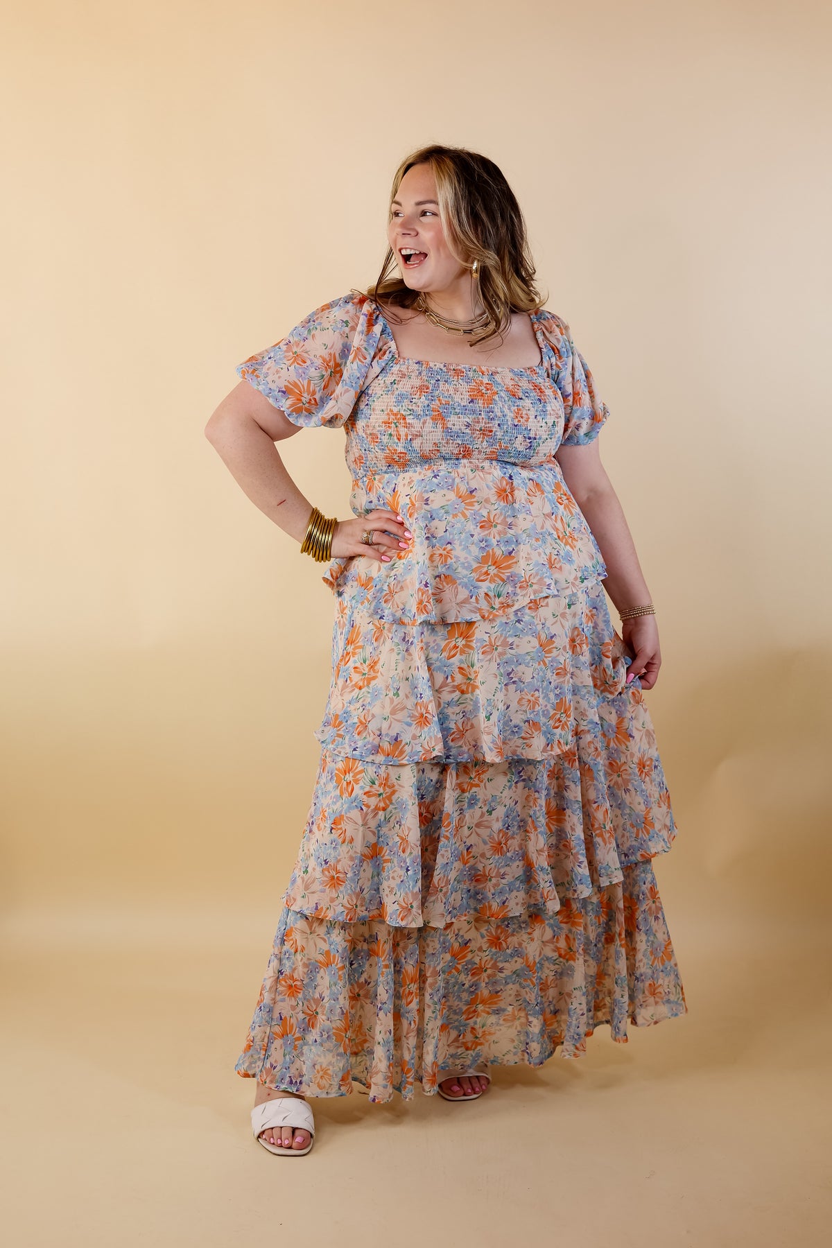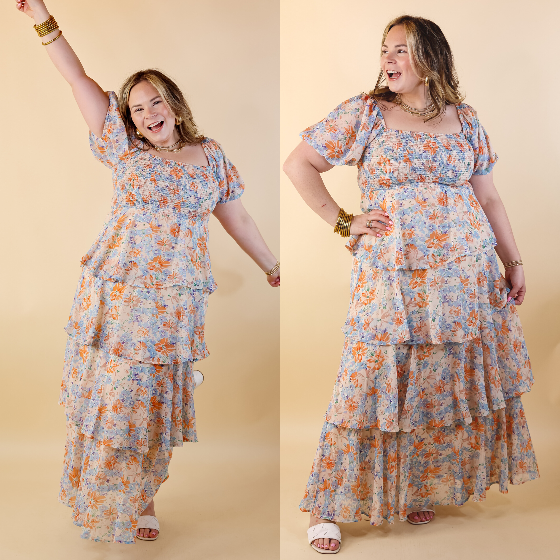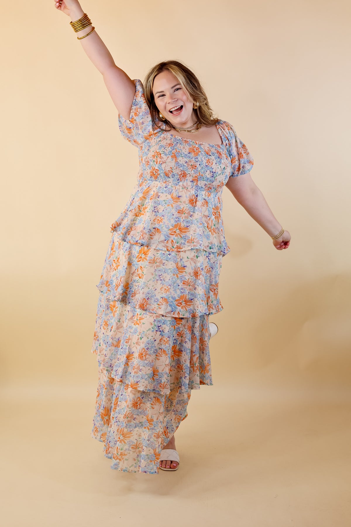 Fun Feeling Floral Tiered Maxi Dress with Smocked Balloon Sleeves in Orange Mix