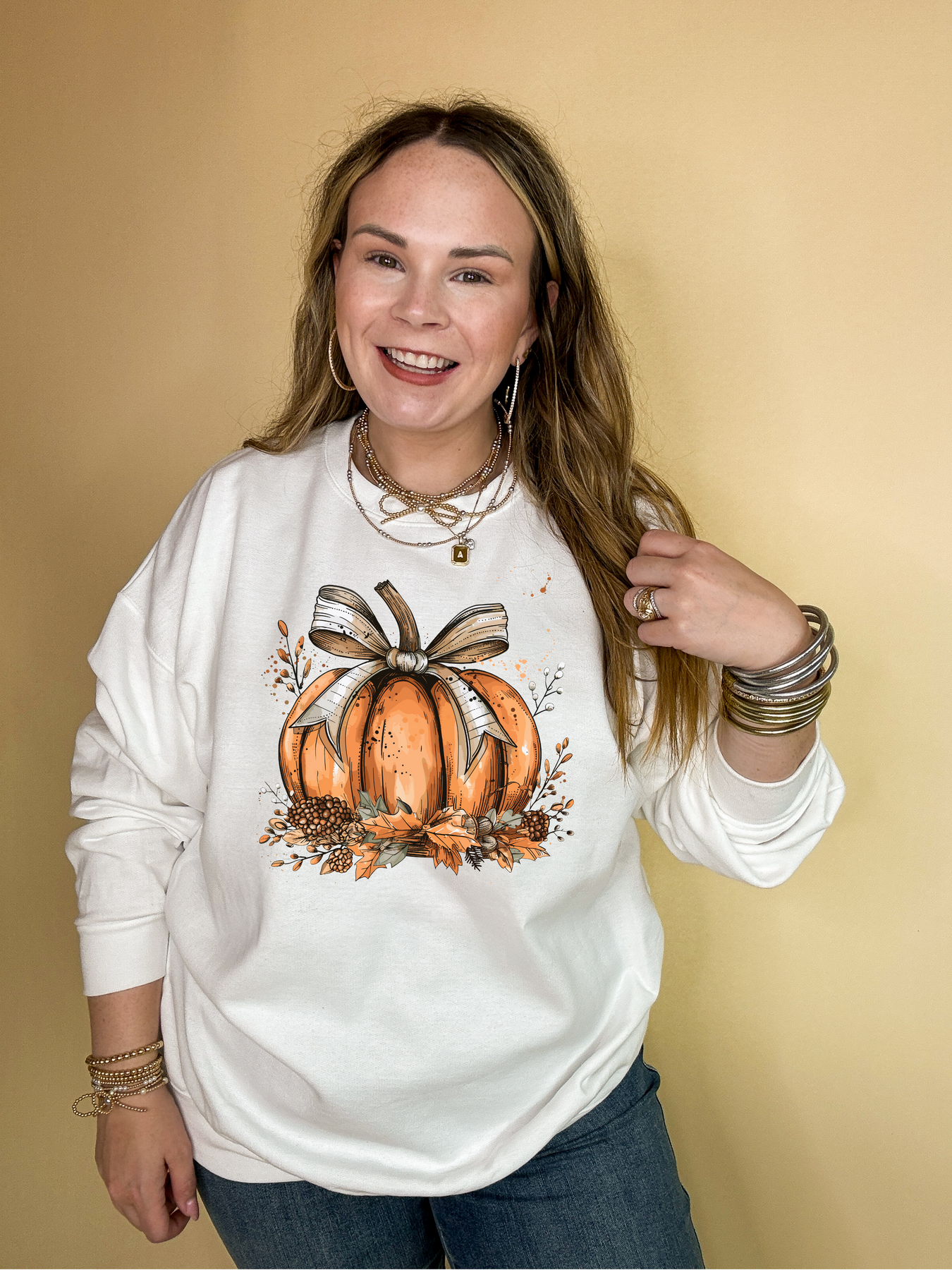 Online Exclusive | Chic Autumn Pumpkin on a Bed of Leaves with Off White Bow Graphic Sweatshirt in Multiple Color Options