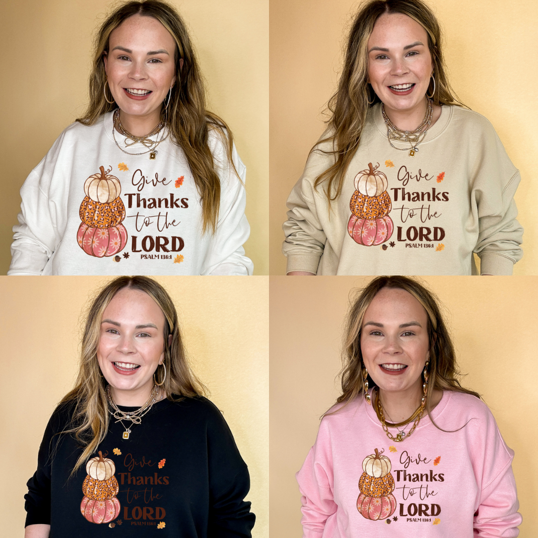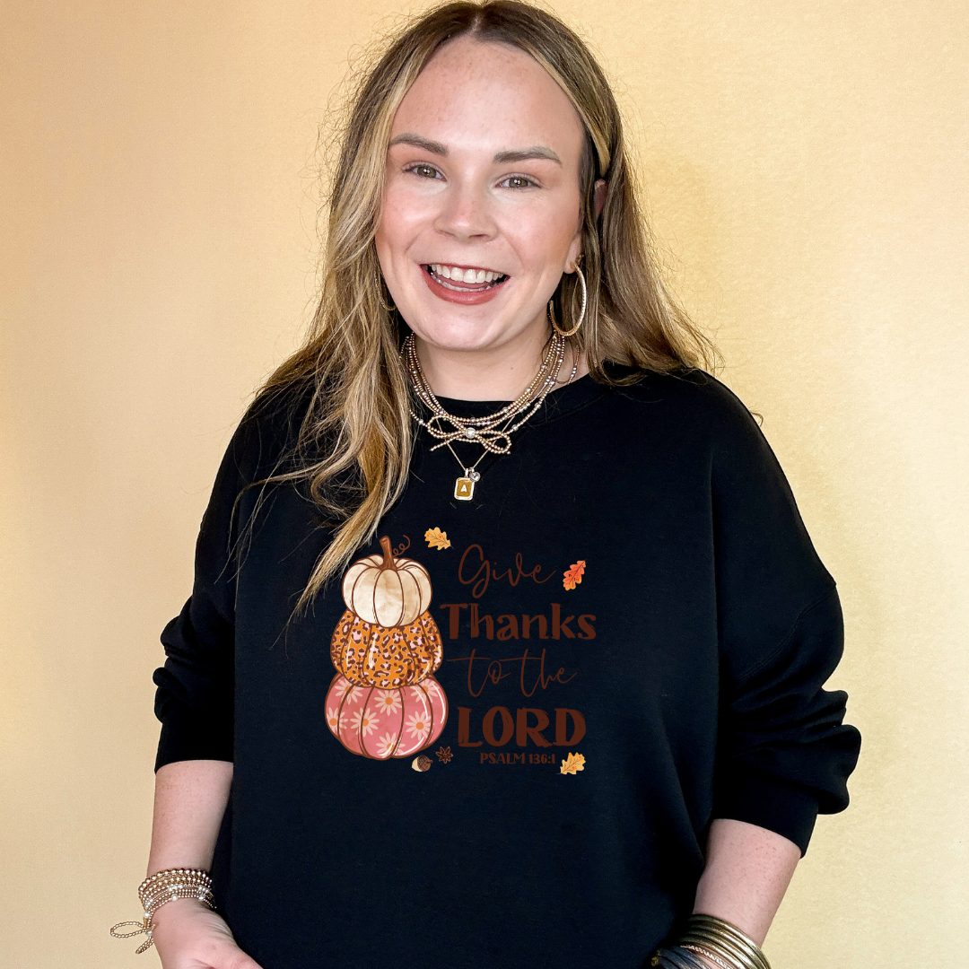 Online Exclusive | Give Thanks to the Lord Psalm 136:1 Stack of Pumpkins Graphic Sweatshirt in Multiple Color Options