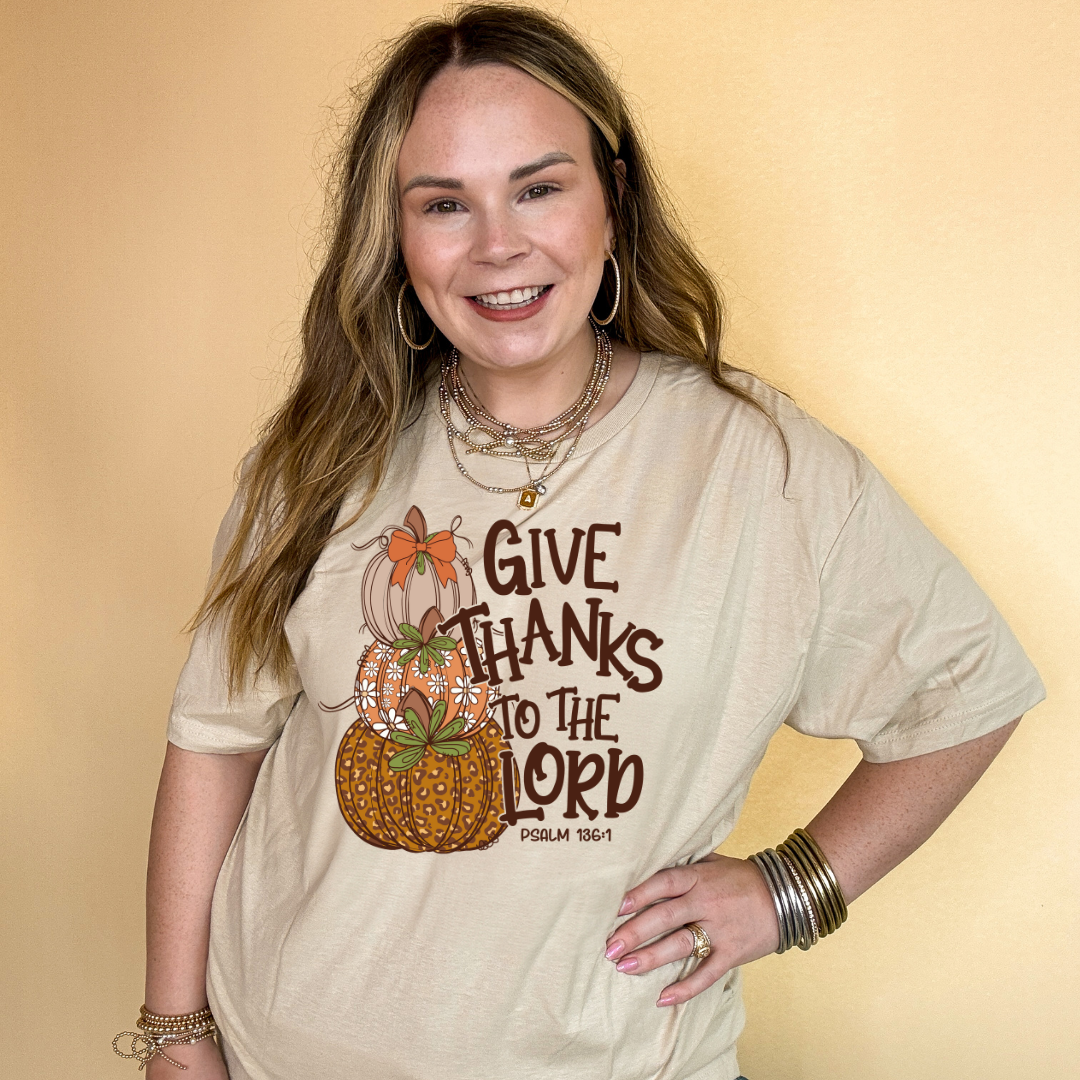 This Tee features a powerful reminder to "give thanks to the Lord" with a stacked pumpkins, including a cheetah print, floral, and bow-adorned pumpkin. Choose from multiple color options. Show your gratitude in style!