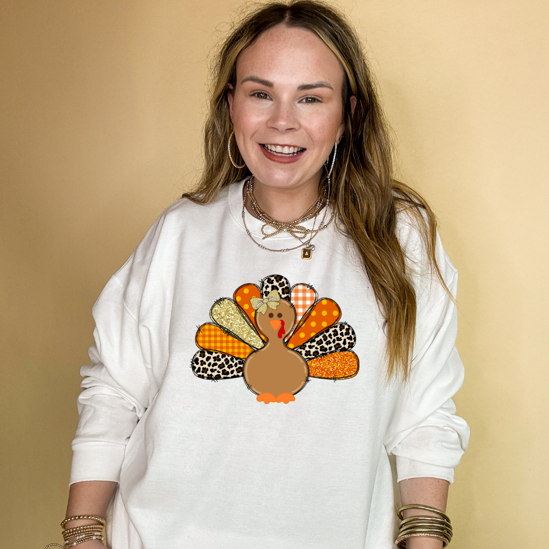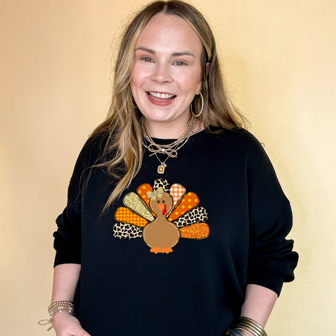 Fall in love with our Patched Turkey Sweatshirt! The vibrant colors and playful turkey design, complete with a stylish bow, will make a statement wherever you go. Its unique feather patches of cheetah, polka dot, gold shimmer, plaid, and orange shimmer add a touch of personality to your wardrobe. Don't miss out on this must-have for the holiday season!
