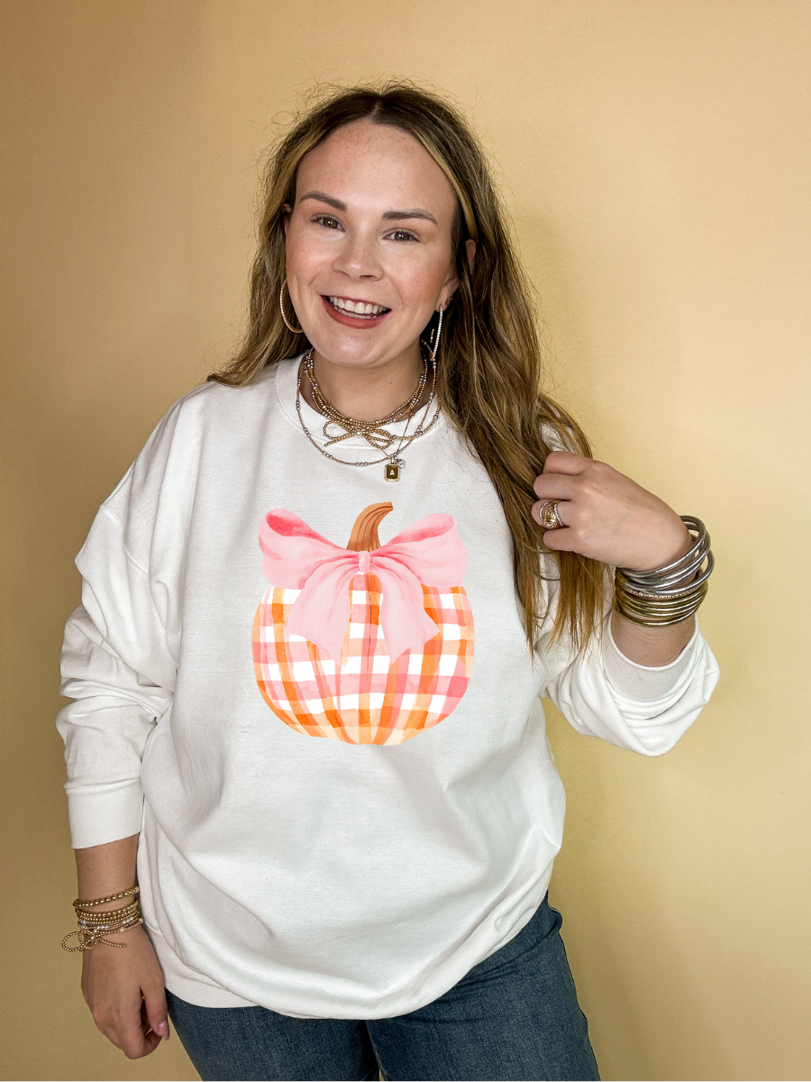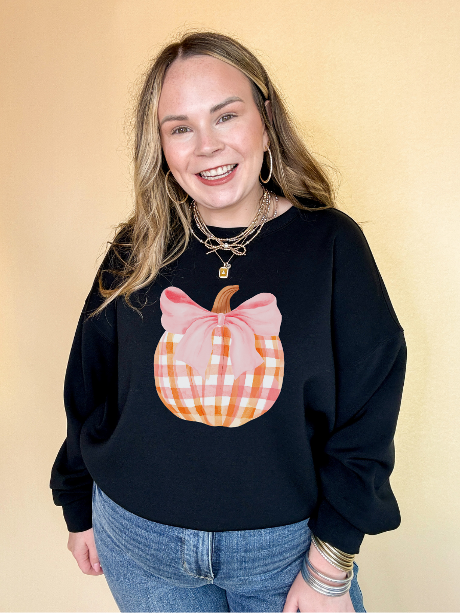 Online Exclusive | Charming Orange and White Plaid Pumpkin with Pink Bow Graphic Sweatshirt in Multiple Color Options