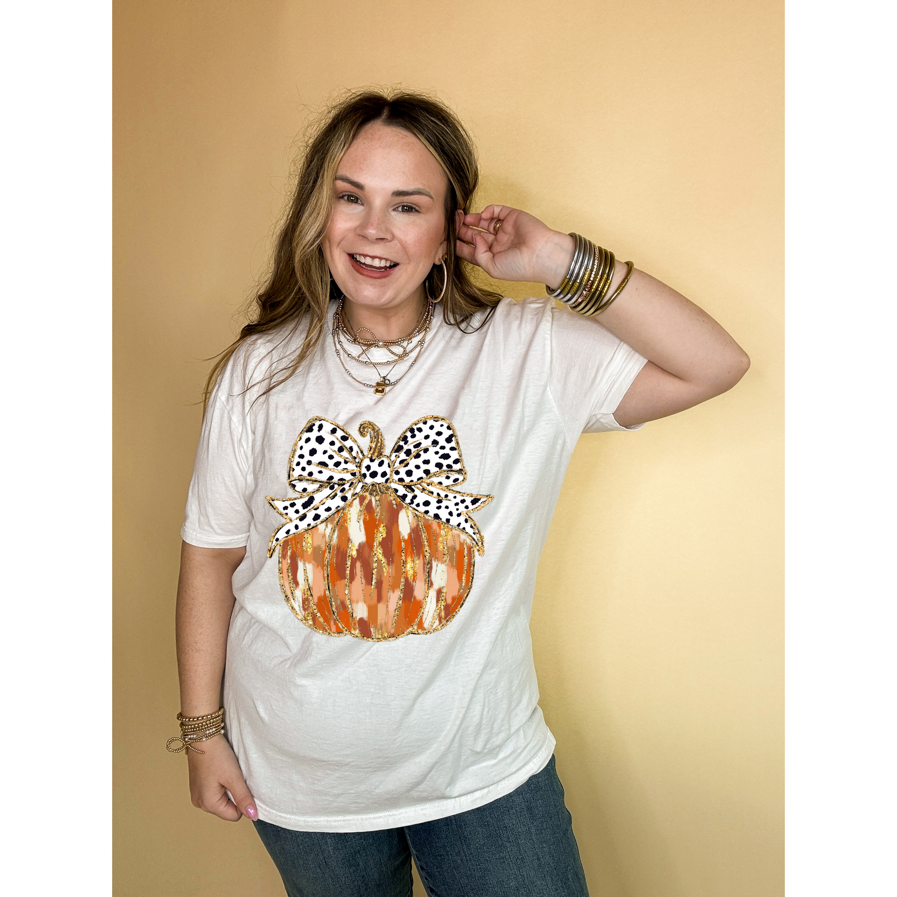 Online Exclusive | Spots & Spice Fall colored Pumpkin with Dotted Bow Graphic Tee in Multiple Color Options