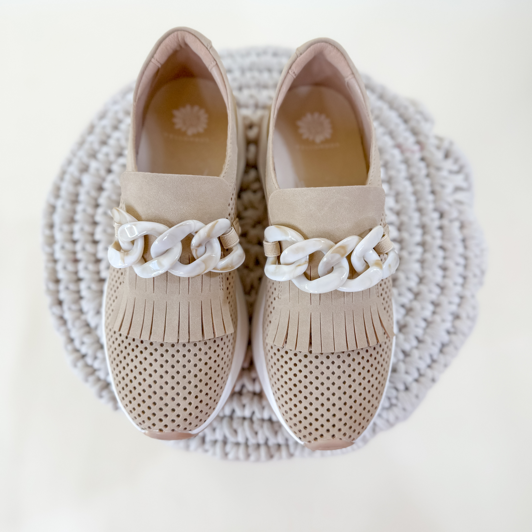 Meet RISKA⎯ an adorable sneaker that's sure to become your go-to favorite in no time! This charming loafer is designed with a perforated vamp and chunky chain hardware. The lightweight construction and removable insole make RISKA the perfect choice for those who want to make a fashion statement while feeling light on their feet.