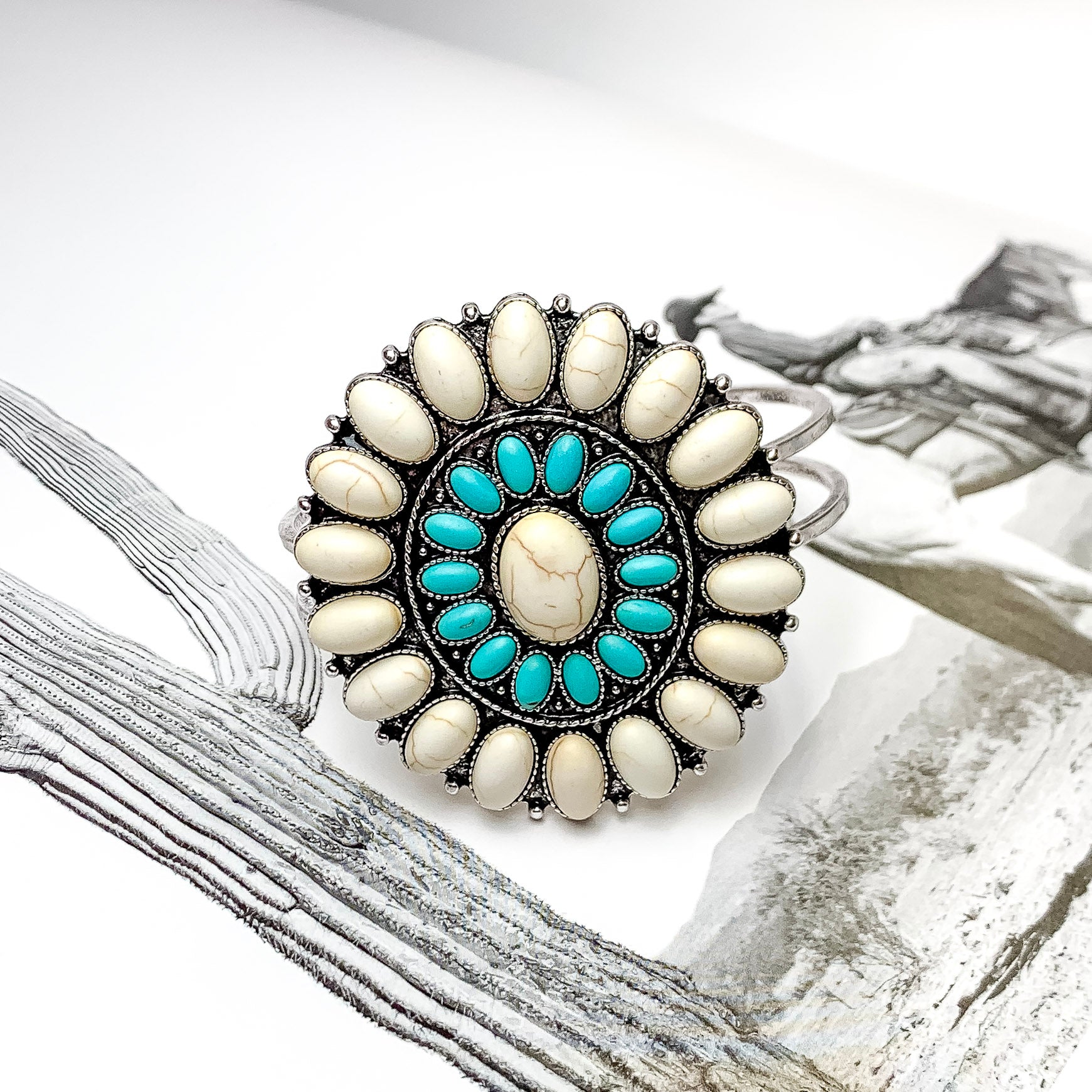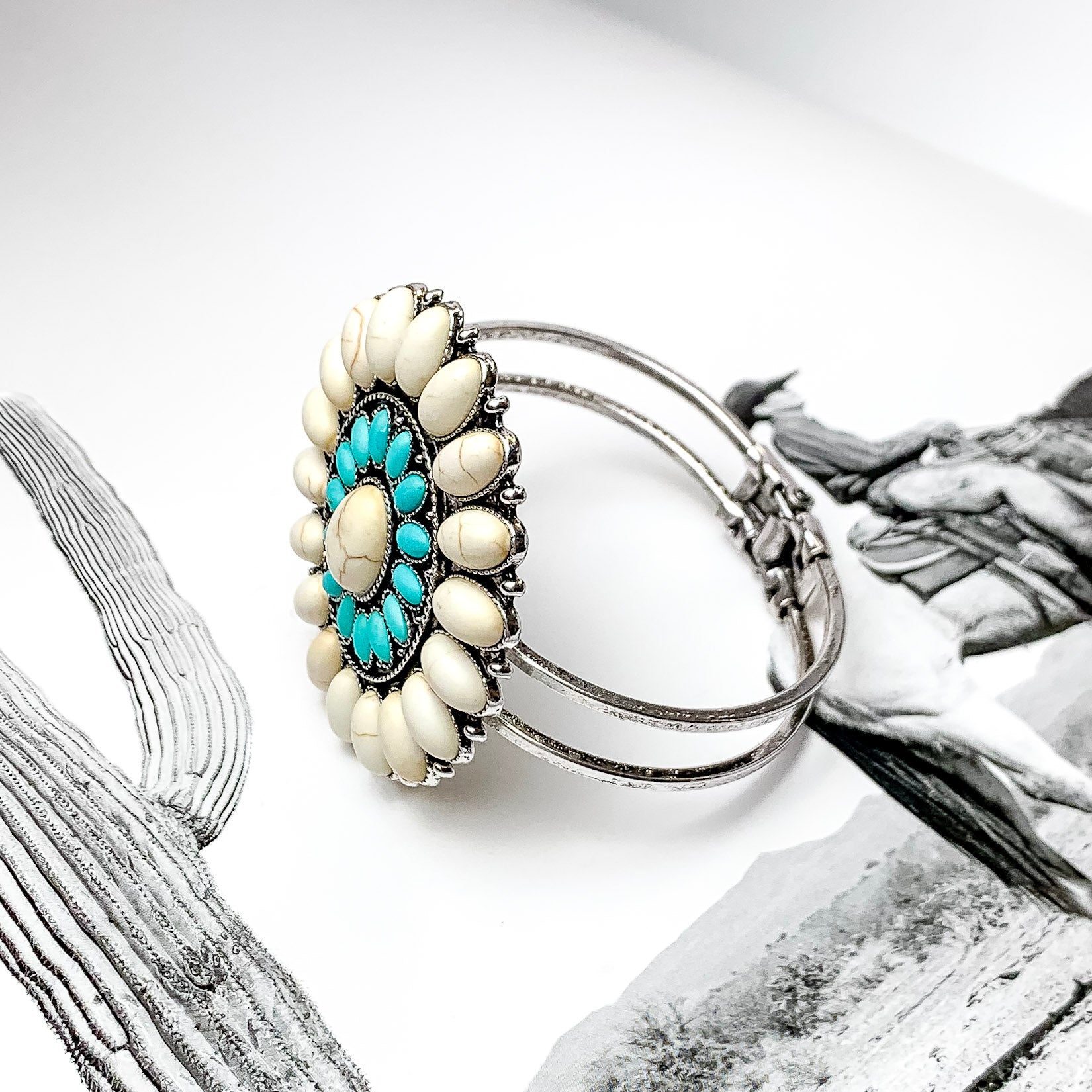 Ivory and Turquoise Oval Stone Concho Hinge Cuff Bracelet - Giddy Up Glamour Boutique