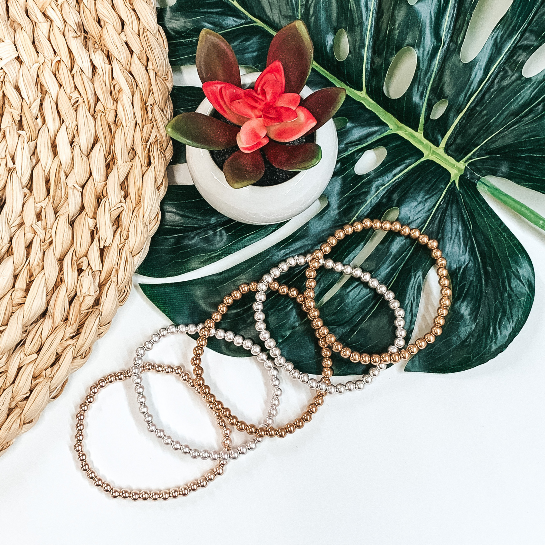 This set of bracelets has gold, silver, and rose gold in the sets. They are perfect for a causal graphic tee kind of day!