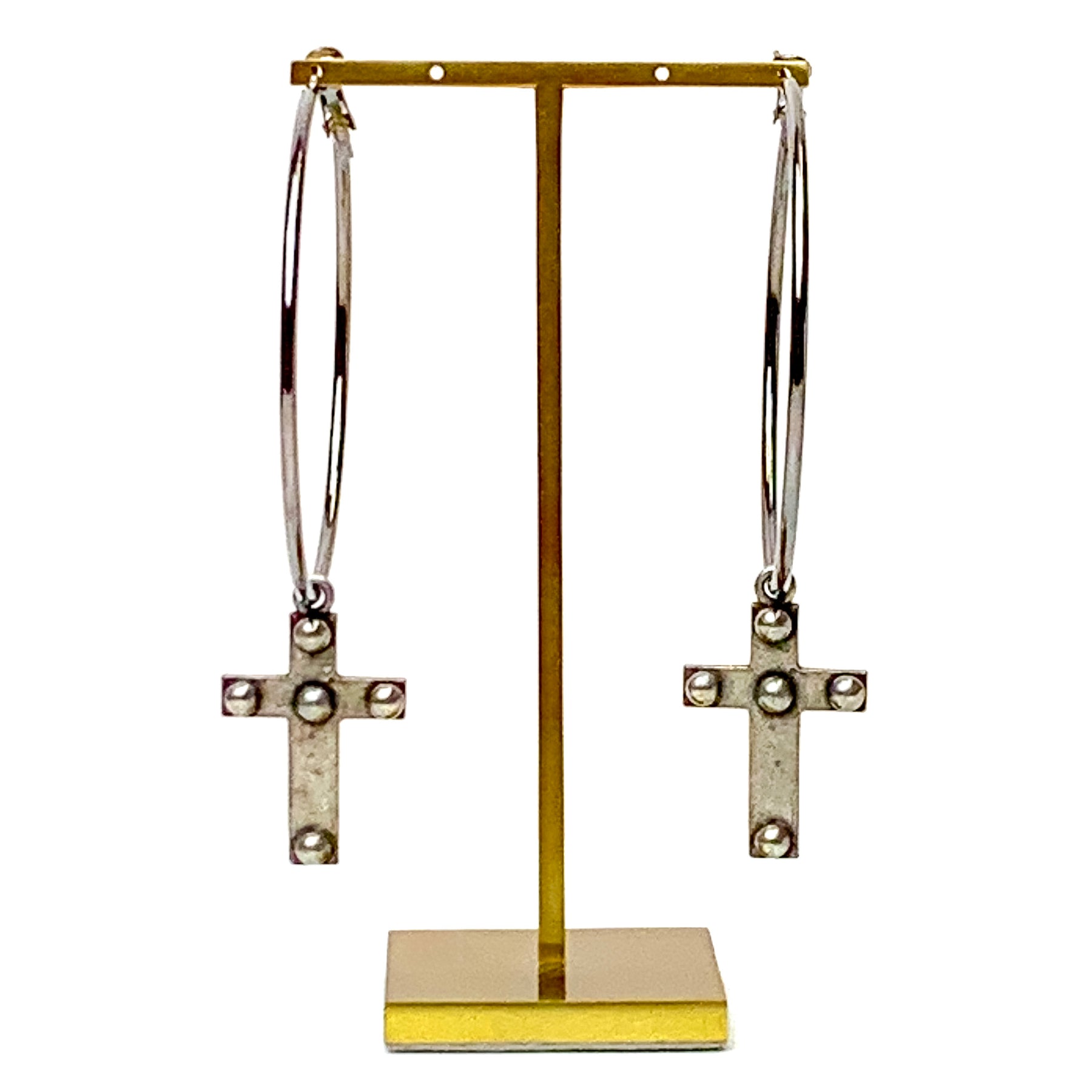 Large Gunmetal Tone Hoop Earrings with Studded Silver Tone Cross Charms