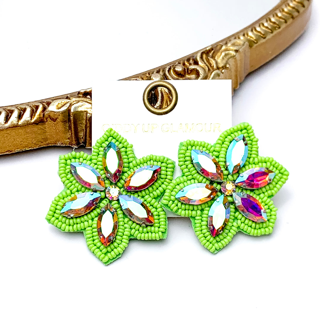 Prismatic Petals Seed Bead Flower Stud Earrings with AB stones in Lime Green
