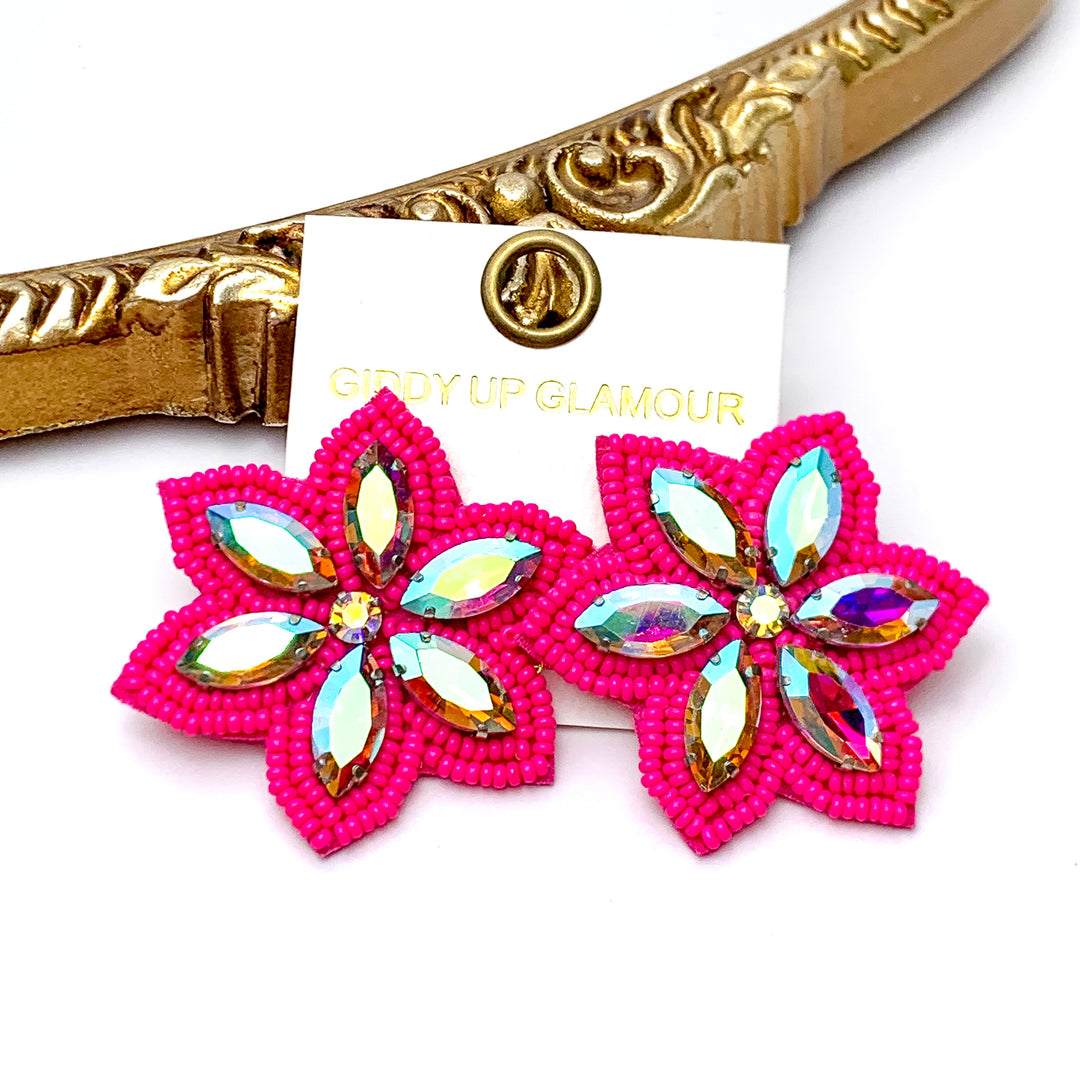 Prismatic Petals Seed Bead Flower Stud Earrings with AB stones in Fuchsia Pink