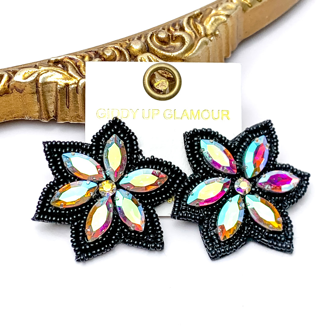 Prismatic Petals Seed Bead Flower Stud Earrings with AB stones in Black