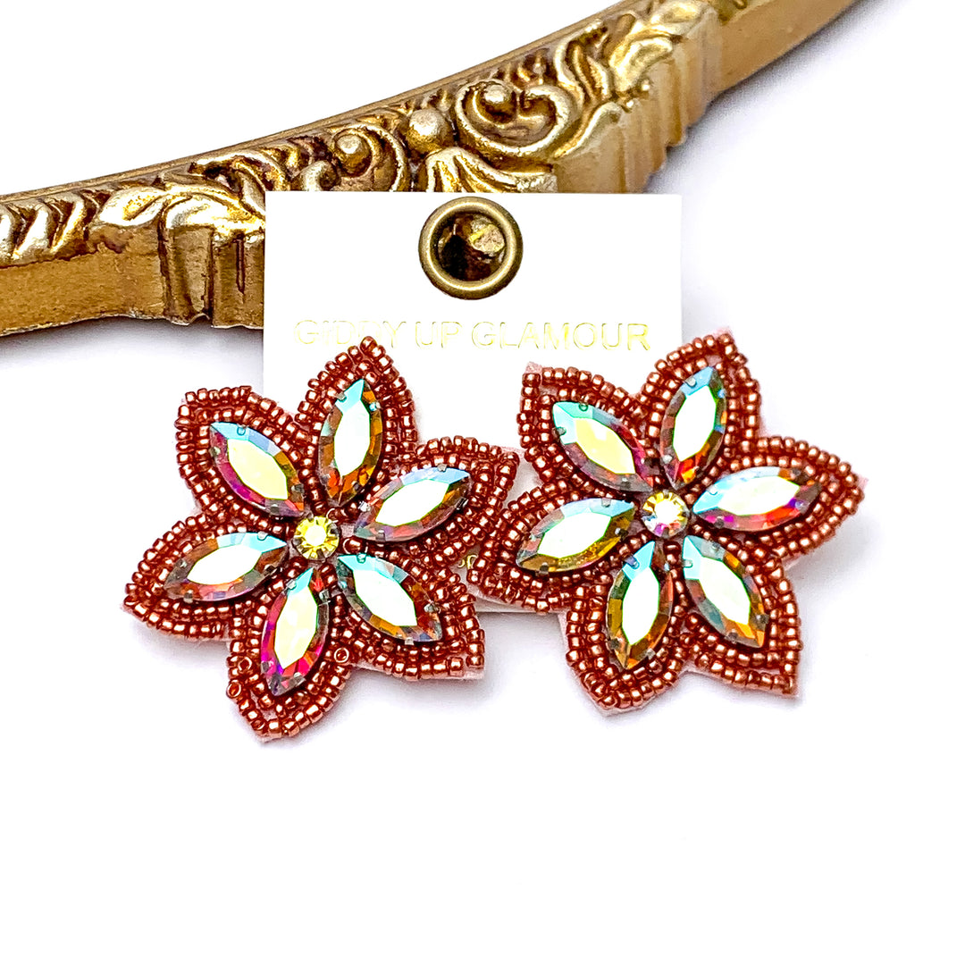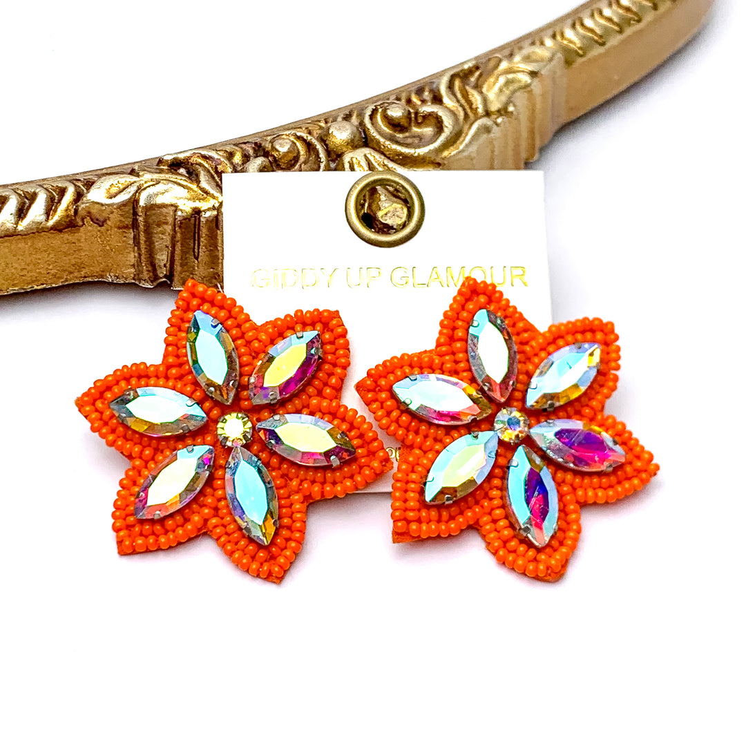 Prismatic Petals Seed Bead Flower Stud Earrings with AB stones in Orange