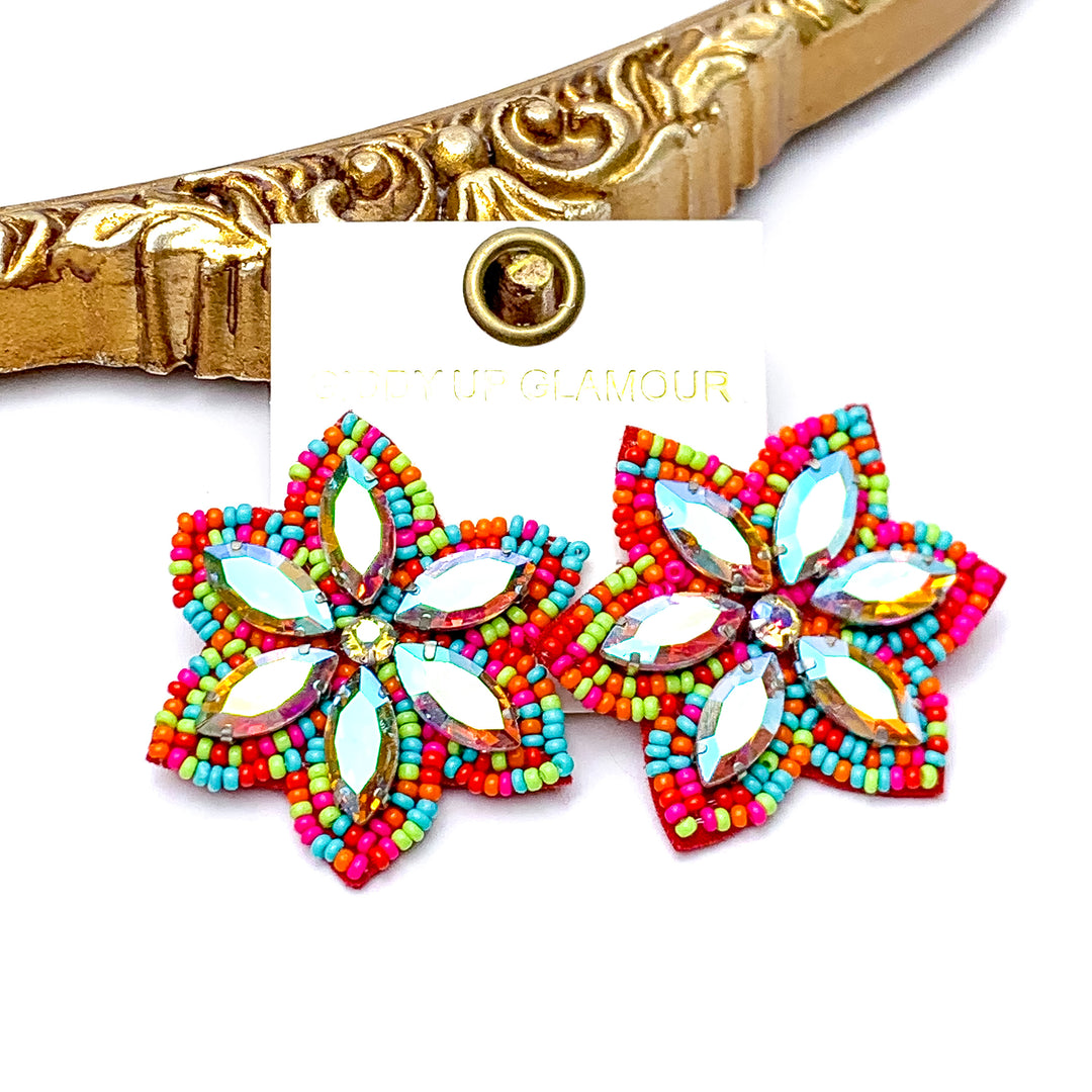 Prismatic Petals Seed Bead Flower Stud Earrings with AB stones in Red Multi Mix