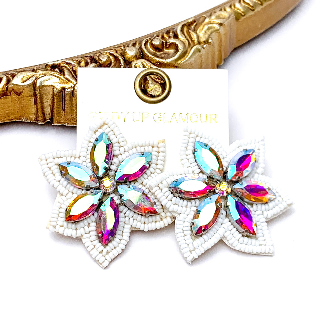 Prismatic Petals Seed Bead Flower Stud Earrings with AB stones in White