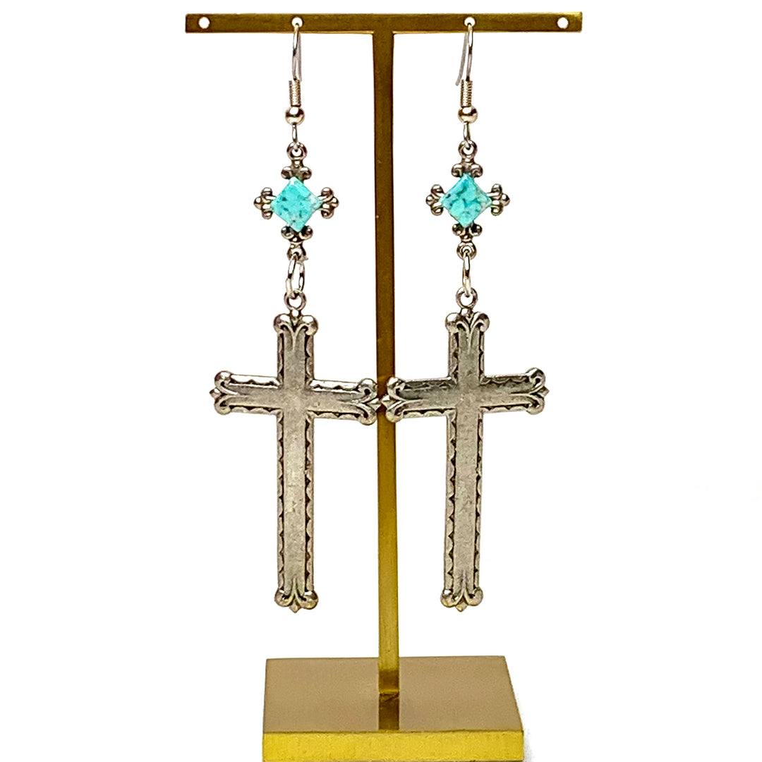 Heavenly Harmony Silver Tone Cross Drop Earrings with Faux Turquoise Accents