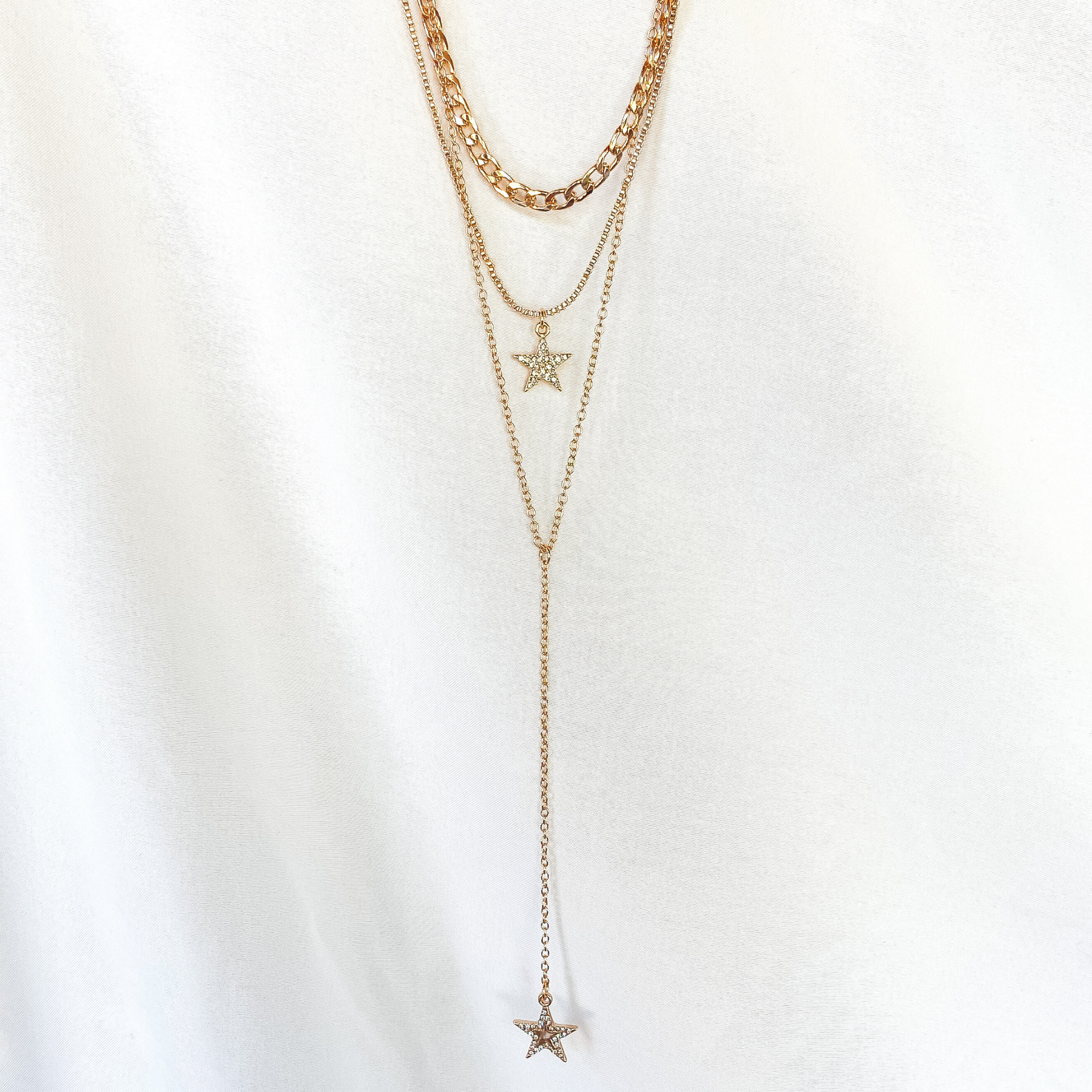 Three Strand Drop Chain Necklace with Crystal Star Pendants in Gold