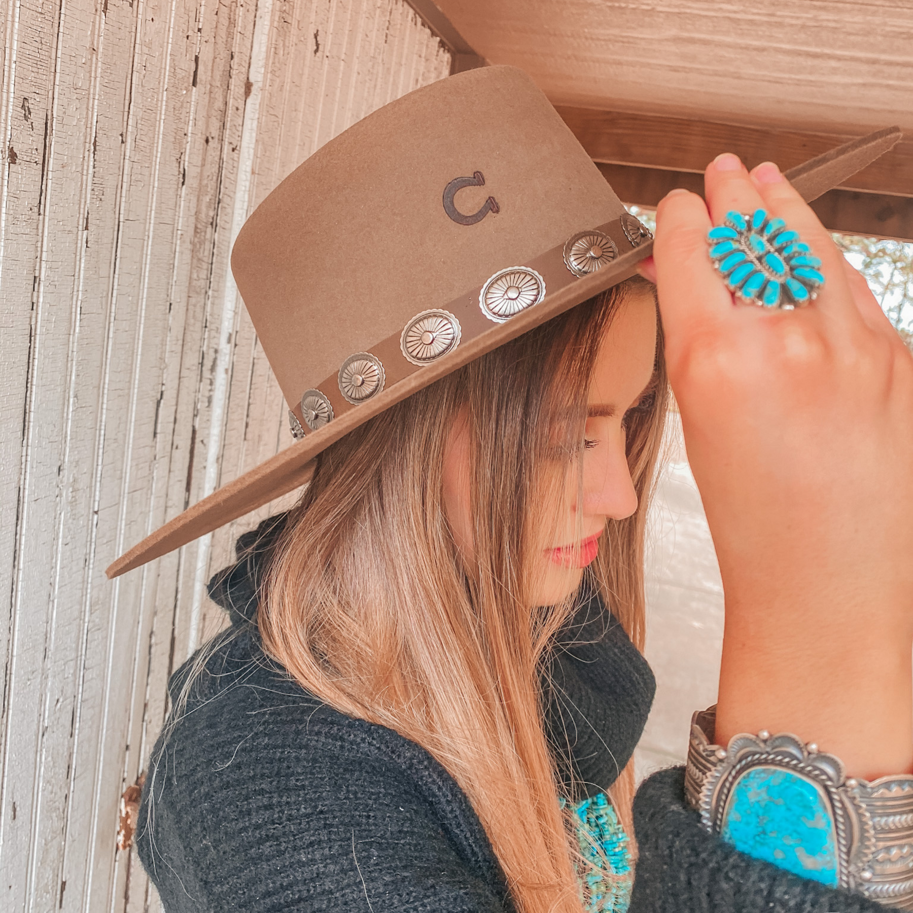 The High Desert hat by Charlie 1 Horse features wool felt material, an open face profile, a 4 1/4 inch brim, and a full circle crown. The hatband is genuine brown leather with concho detailing. This genuine Charlie 1 Horse hats bears the brand "C," a sign that you are getting a quality made authentic Charlie 1 Horse hat. Please note that all hats are branded by hand by a hatmaker at Charlie 1 Horse, with that, all brands are intended to be off-centered. Add the perfect western flare to any outfit with this hat!