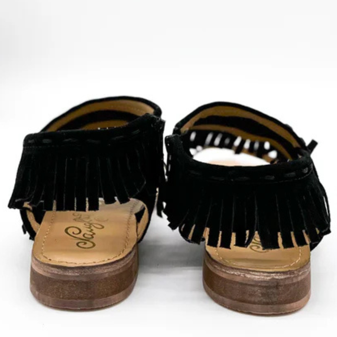 Experience style and comfort with these versatile Fringe Star Sandals in Black! You'll love how it complements any outfit. Made with a faux suede upper and a convenient side zip, these sandals have a .5 inch heel and fit true to size. Don't settle, size up if you're in between sizes!