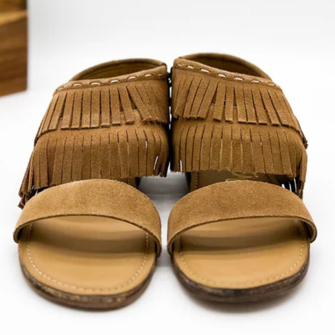 Experience style and comfort with these versatile Fringe Star Sandals in Tan! You'll love how it complements any outfit. Made with a faux suede upper and a convenient side zip, these sandals have a .5 inch heel and fit true to size. Don't settle, size up if you're in between sizes!
