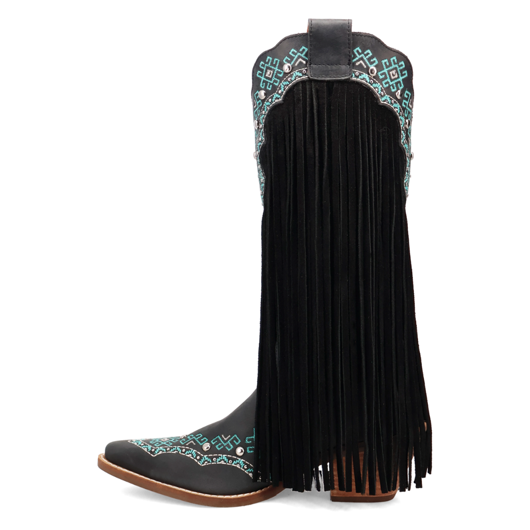 Elevate your western fashion game with Dingo's Tequila Sunrise Suede Boots. These long fringe boots in black feature stunning turquoise embroidery and playful bronze studs. These boots are a must-have for any fashion-forward cowgirl. Preorder yours now!