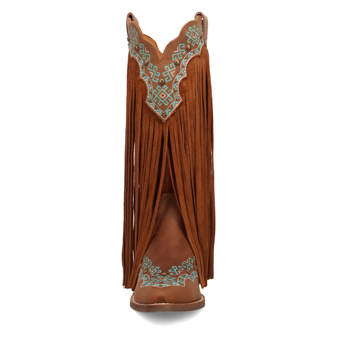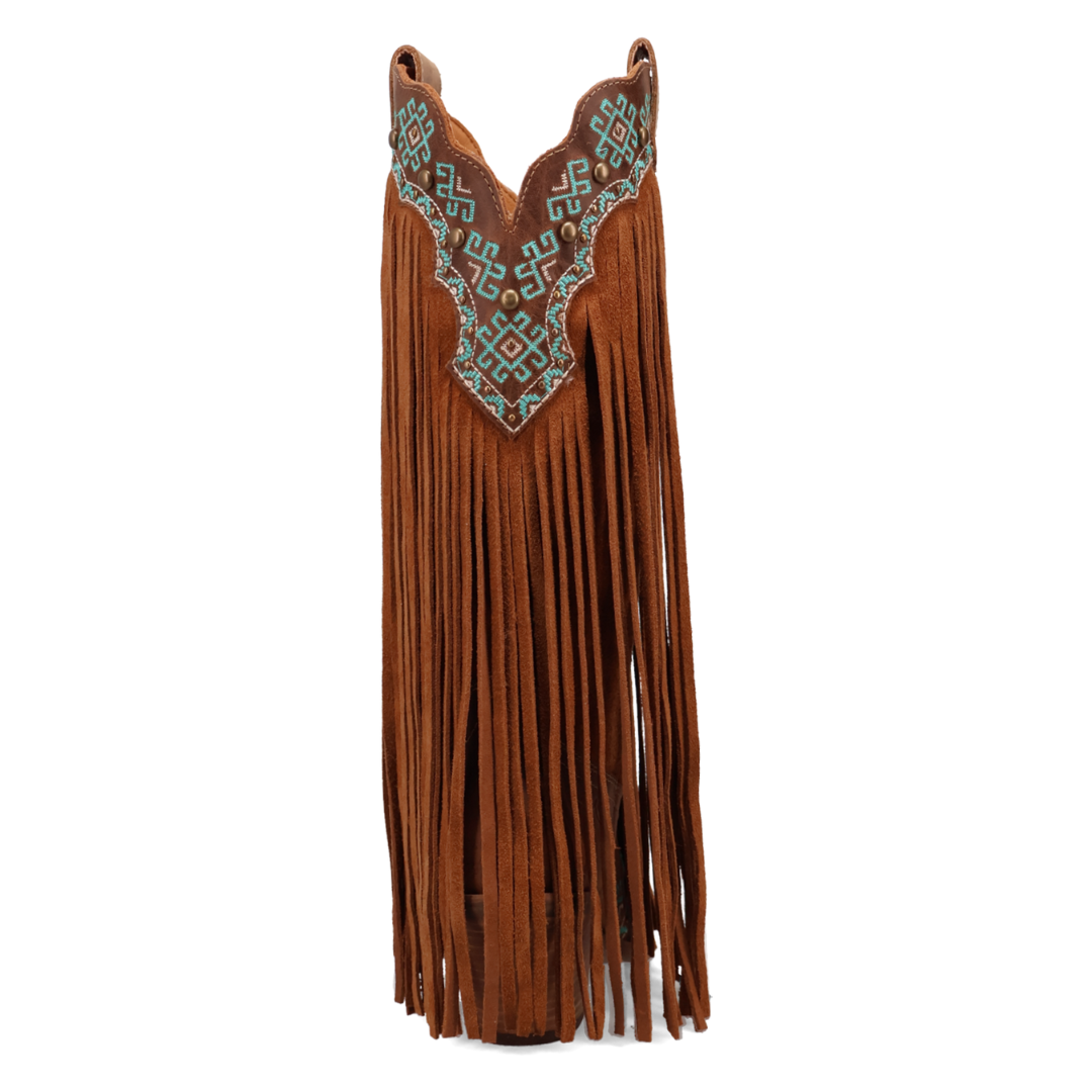 Elevate your western fashion game with Dingo's Tequila Sunrise Suede Boots. These long fringe boots in brown feature stunning turquoise embroidery and playful bronze studs. These boots are a must-have for any fashion-forward cowgirl. Preorder yours now!