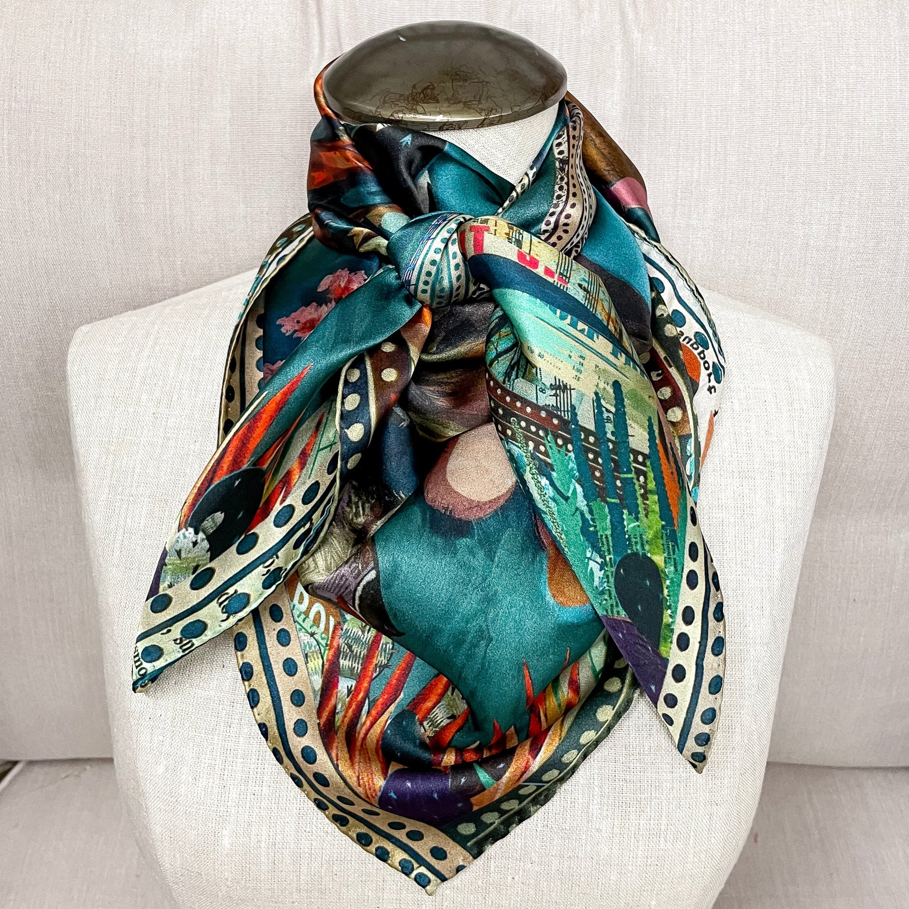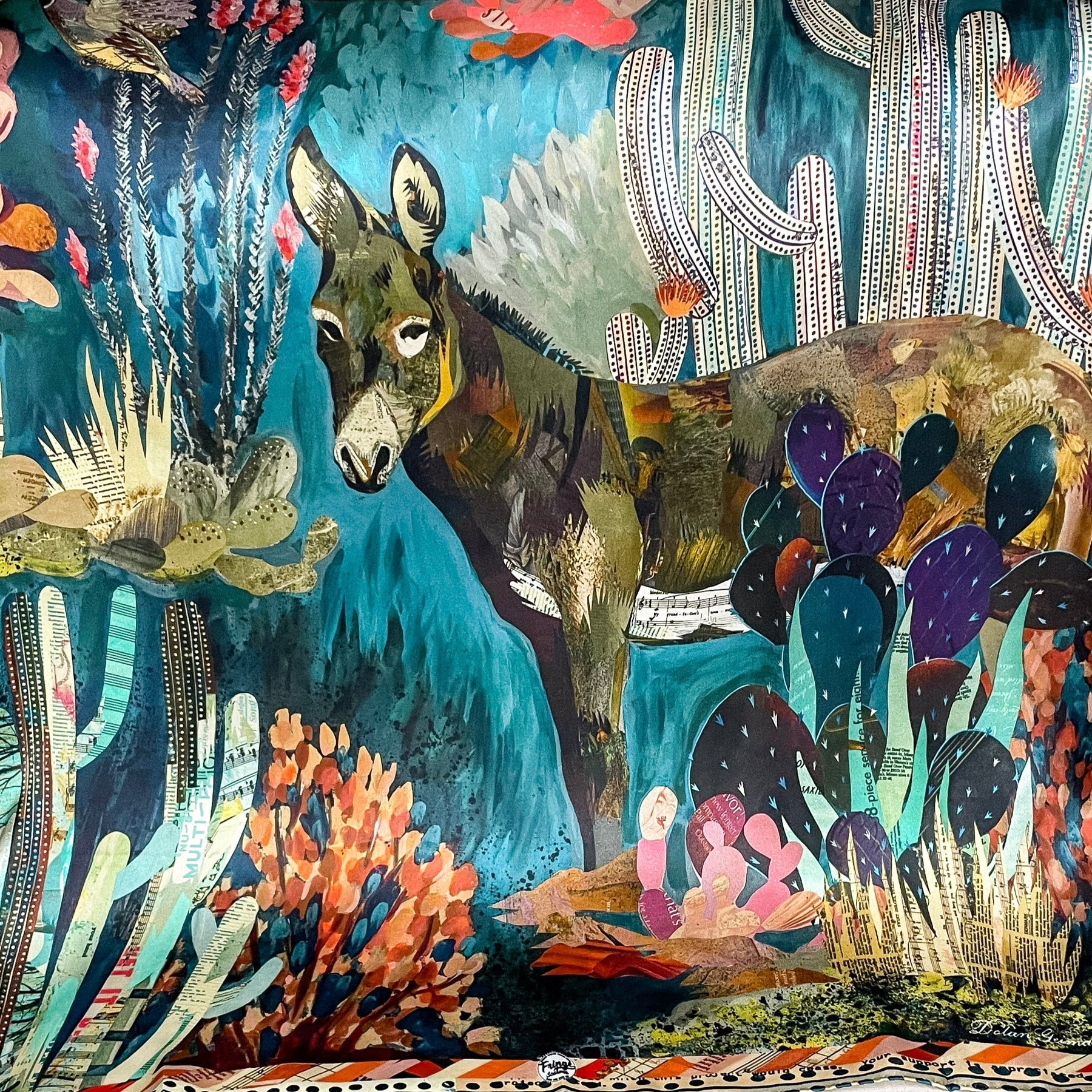 Introducing the Burro Country Shorty Wild Rag, a versatile accessory featuring a charming country scene with a donkey, cactus, and other natural elements. The muted colors add to its rustic appeal, while its use as a scarf, hair accessory, or purse charm makes it a must-have item for any wild spirit.