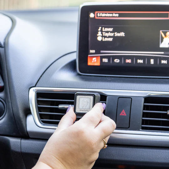 - Connect your Auto Vent Clip to the air vent in your vehicle by sliding the clip onto one of the slats