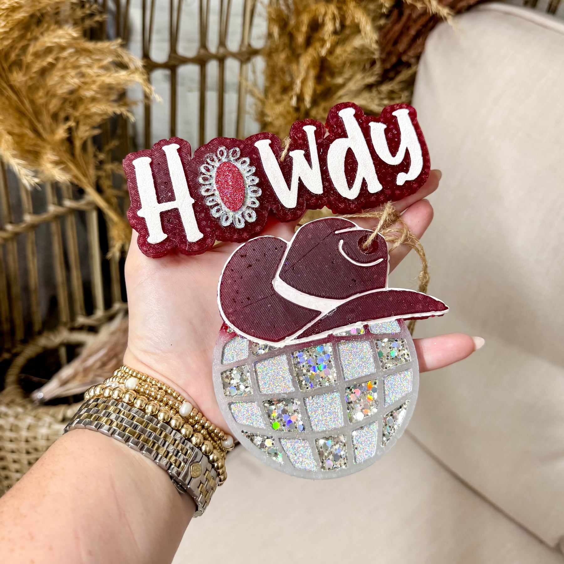 Introducing our Cowgirl Disco Hat Car Freshie, the perfect accessory for your car's interior! This adorable freshie features a glittery disco ball topped with a sassy maroon cowboy hat, adding a touch of western charm to your vehicle. Bring a playful vibe to every drive with our Cowgirl Disco Hat Car Freshie! ๐ค ๐๐