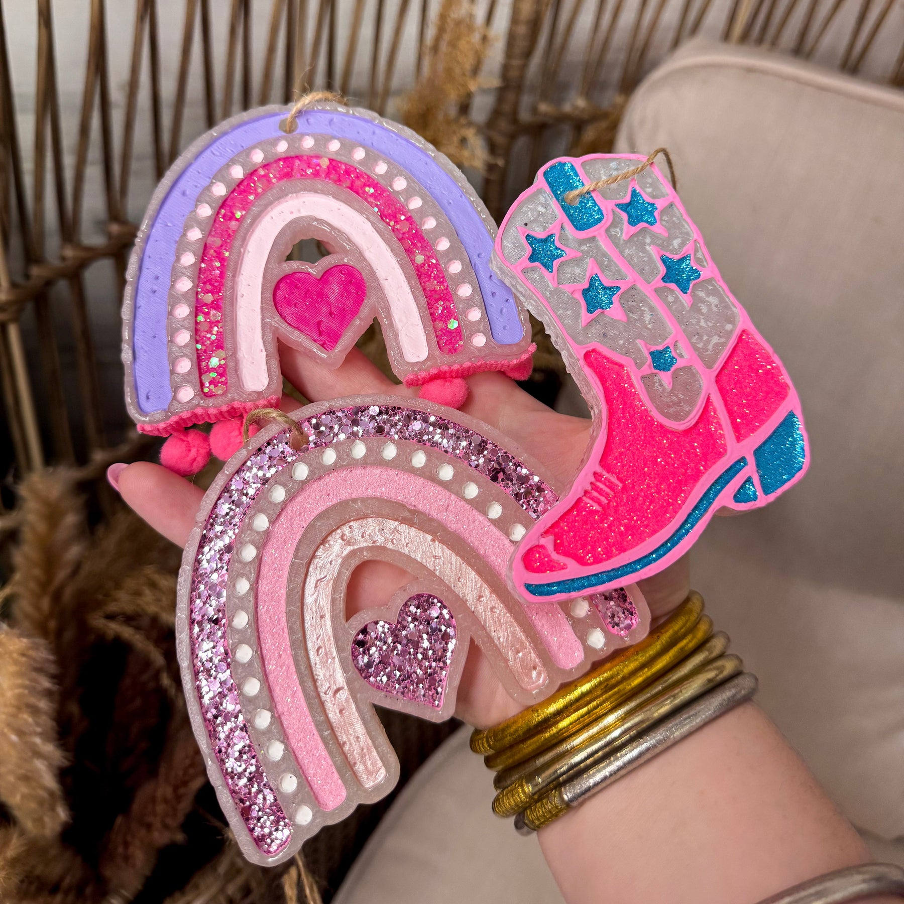Pretty, playful, and full of charm. This pink and purple rainbow freshie is topped with a heart in the center and finished with flirty pink pom pom fringe. Infused with our bestselling Love Spell scent, it’s the perfect mix of sweet, soft, and just a little sassy. Hang it up and let those dreamy vibes (and compliments) roll in.