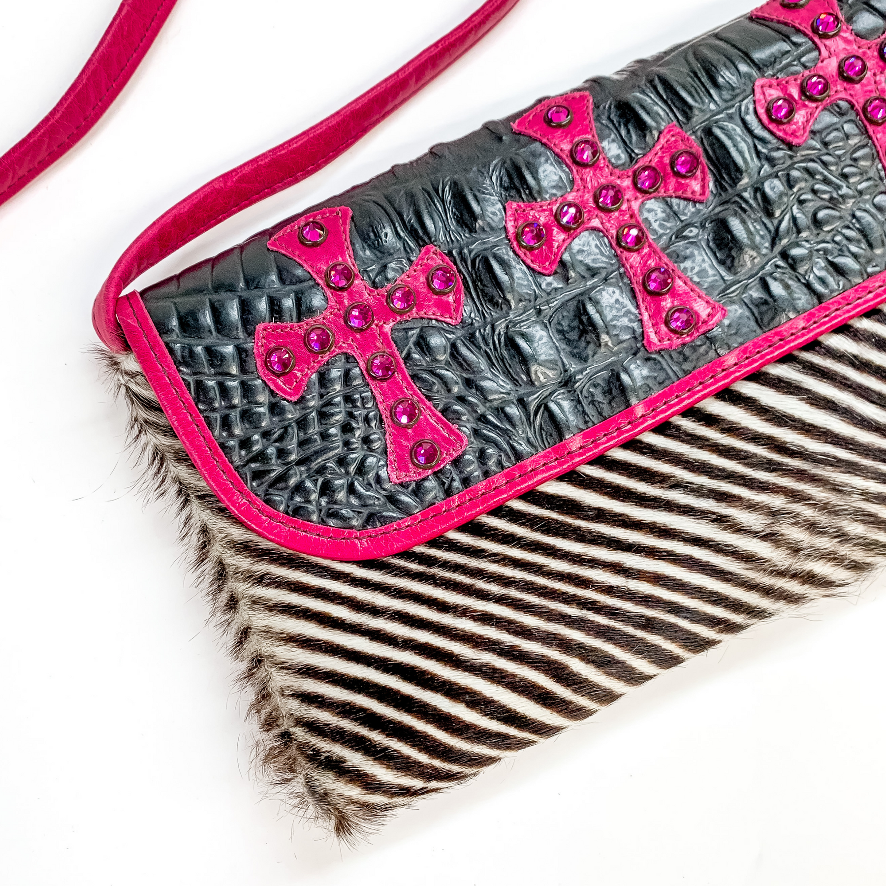 KurtMen Designs | Pink Crystal Cross Crocodile and Zebra Crossbody Clutch