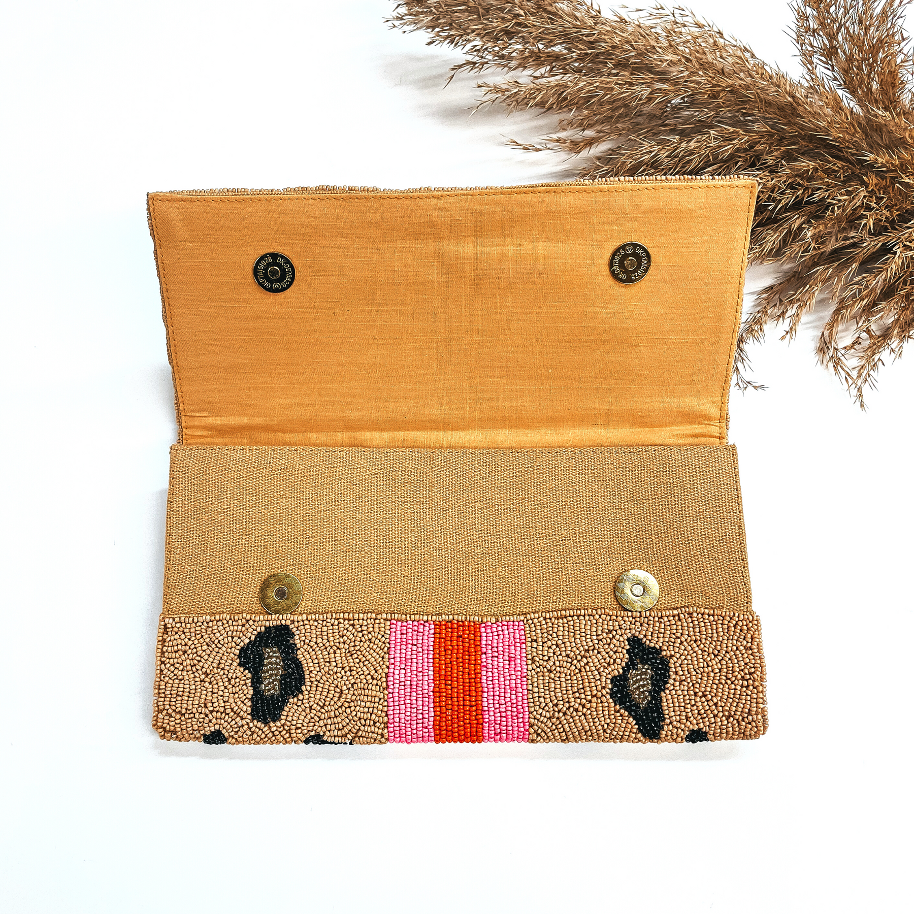 Incredible Love Seedbeaded Striped Clutch Bag in Leopard Print with Gold Tone Chain