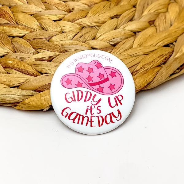 Giddy Up Glamour Gameday Button Pin in Maroon and White