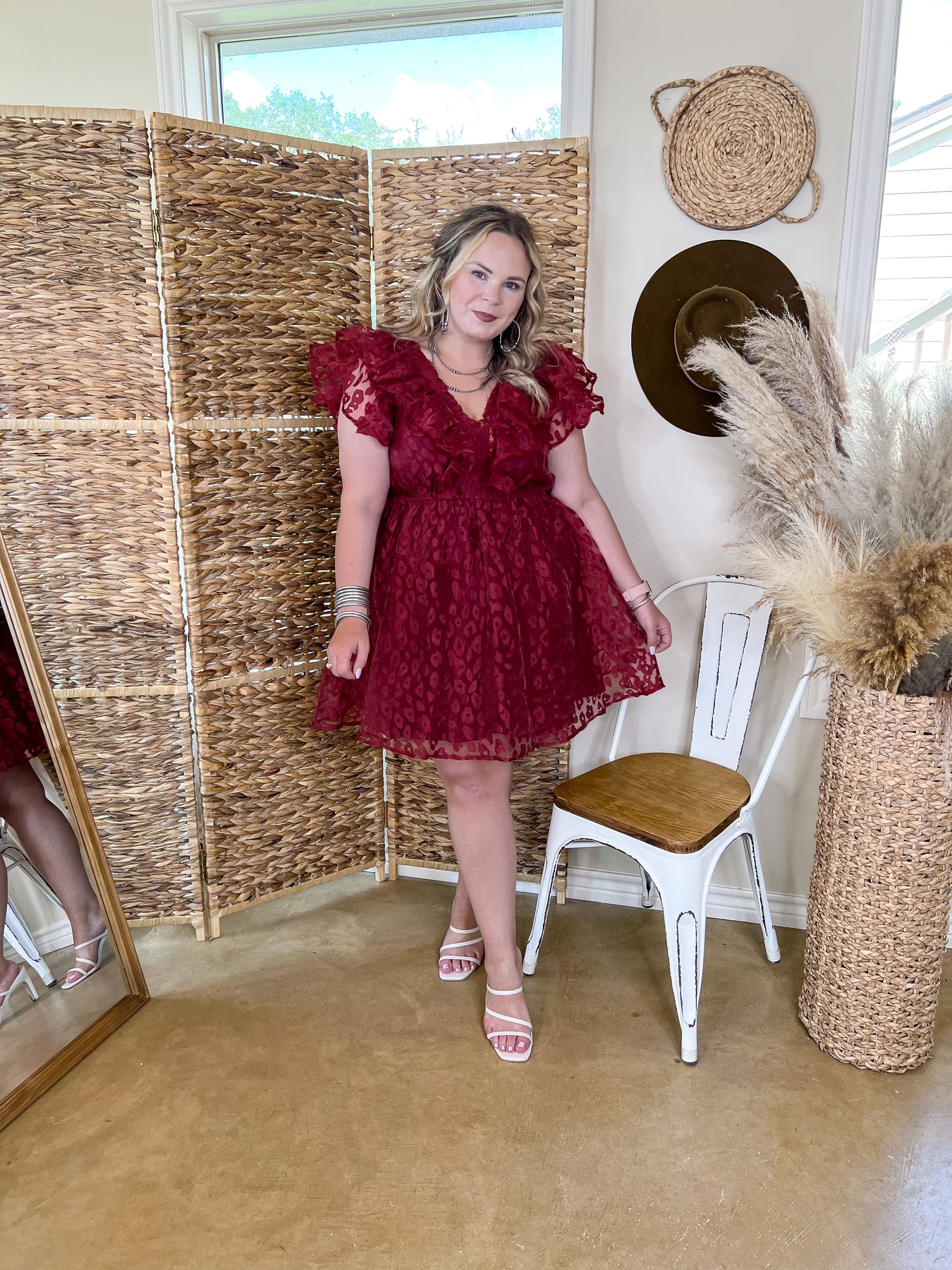 Last Chance Size Large | Welcome To Hollywood Sheer Leopard Print Dress with Ruffle Detail in Maroon