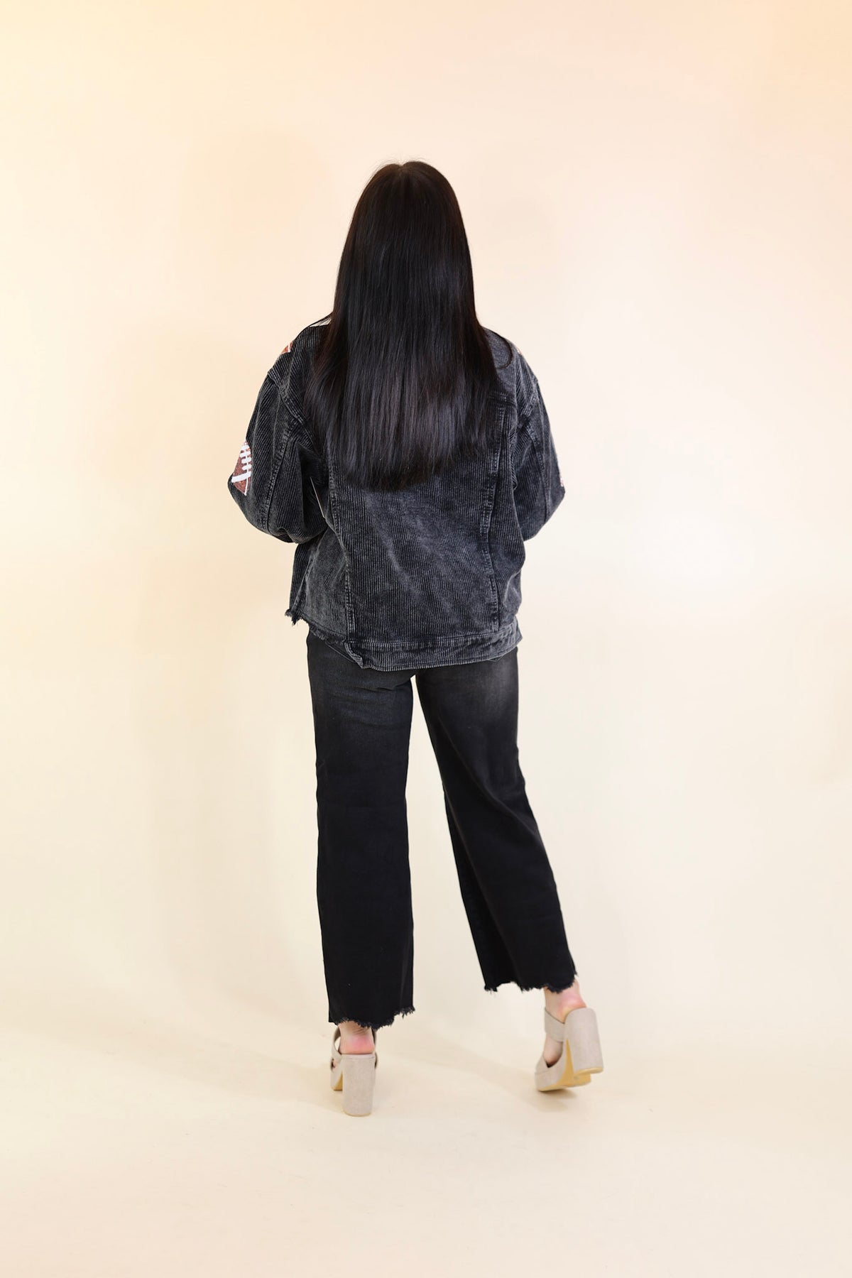 Gameday Ready Corduroy Shacket with Sequin Football Patches in Black