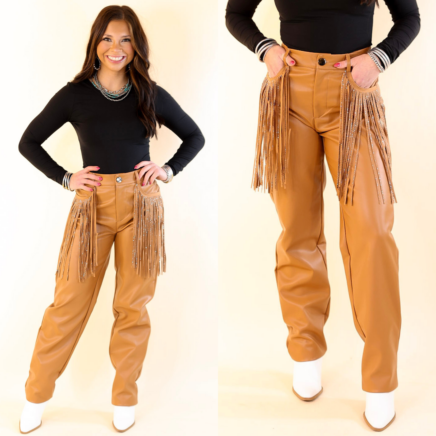 Ready to take your style game to the next level? These pants are the perfect way to do it: featuring brown faux leather pants, crystal fringe pocket lining, and a pleated back, these pants will have you looking fly and feeling fly-er! So why wait any longer? Stand out and show off your style with the Ready Up pants!