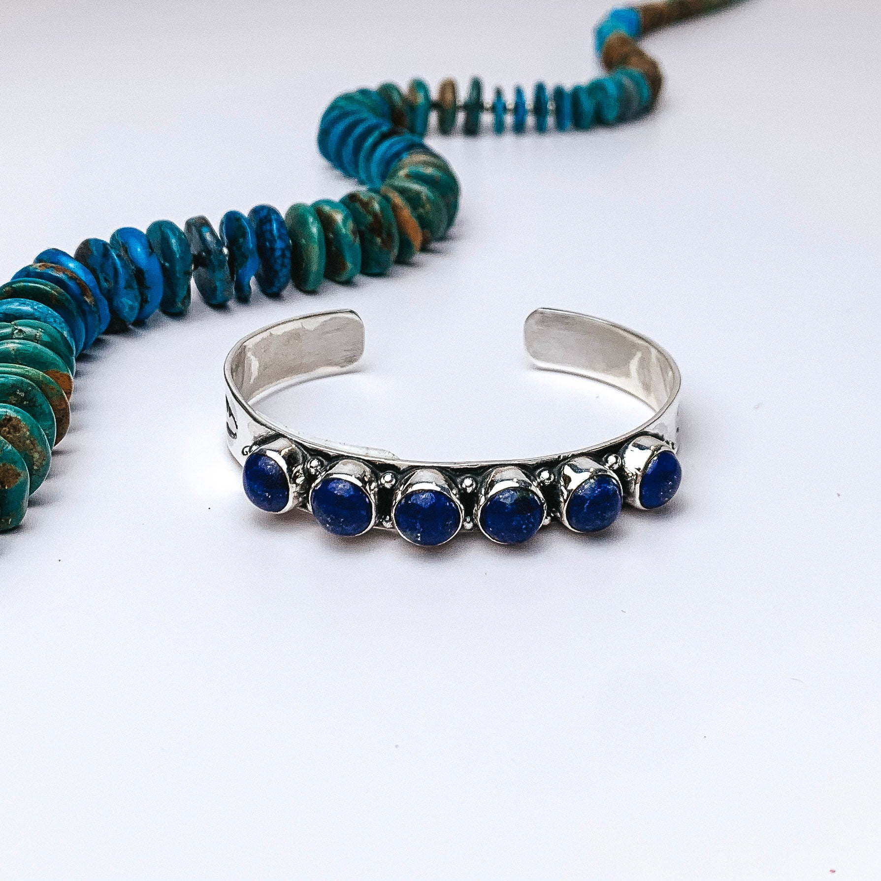 HaDa Collection | Detailed Sterling Silver Cuff with Six Dark Lapis Turquoise Stones