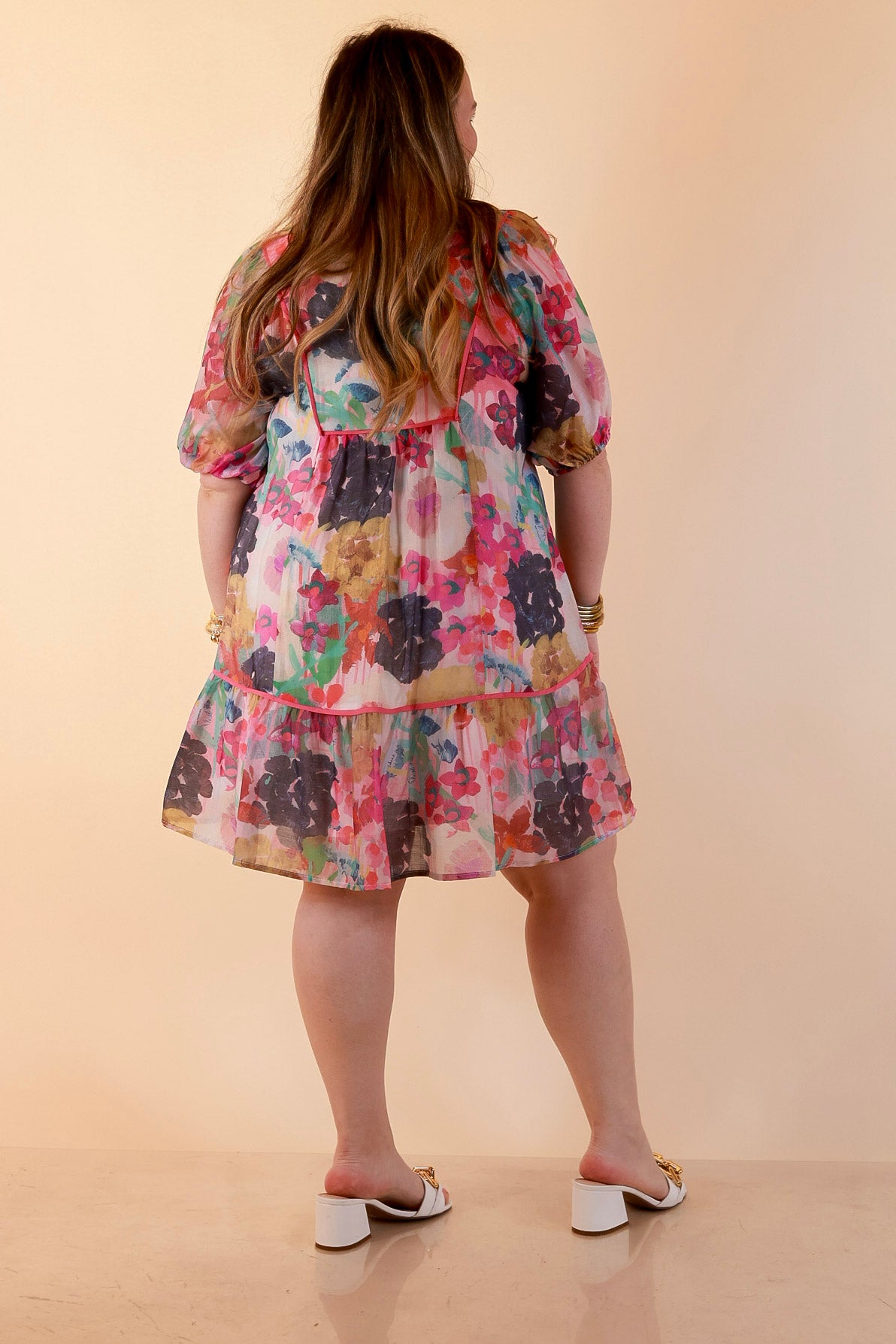 Painted Pretty Floral Print Smocked Yoke Dress with Tie Neckline and Puff Sleeves in Pink Mix