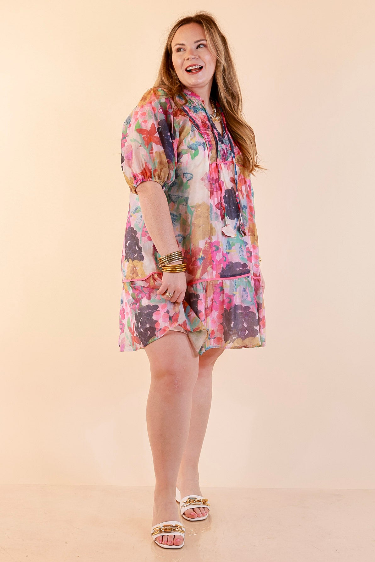 The Painted Pretty Dress brings together a dreamy watercolor-inspired floral print with an easy, flowy silhouette you’ll love wearing. Designed with a smocked yoke for added texture and detail, this dress also features a tie neckline that can be worn relaxed or styled for a more polished look.
