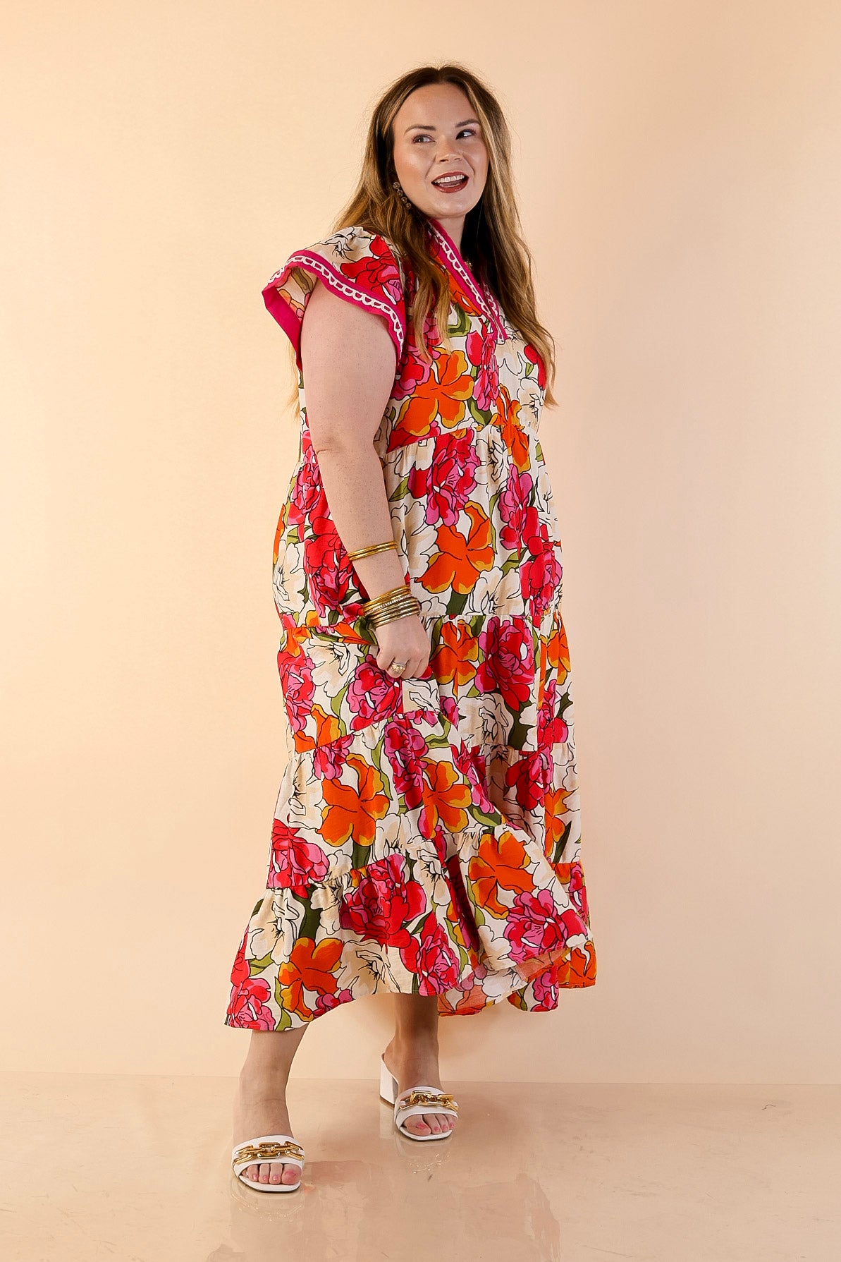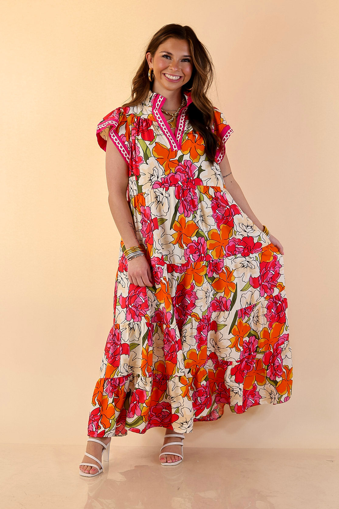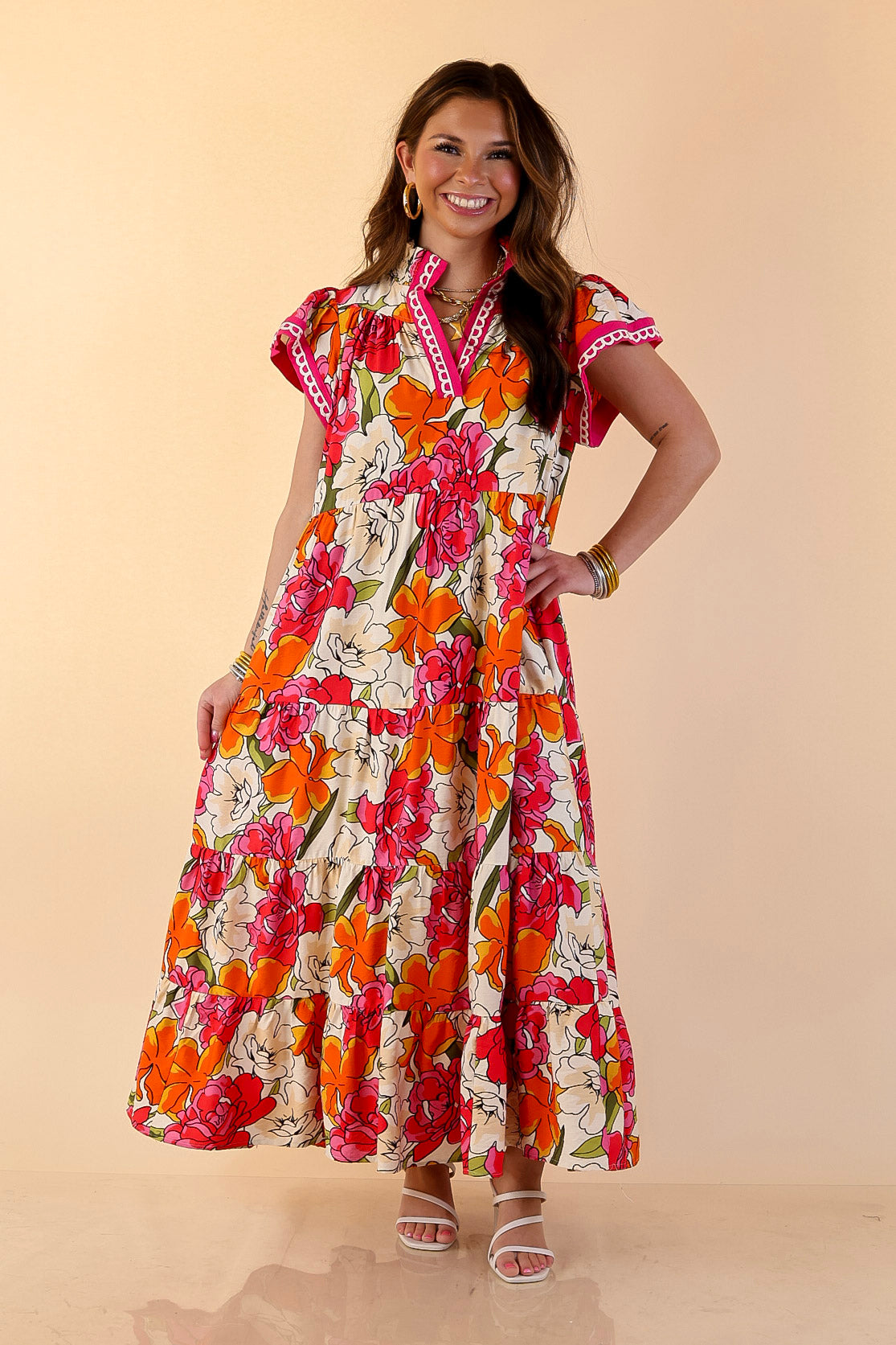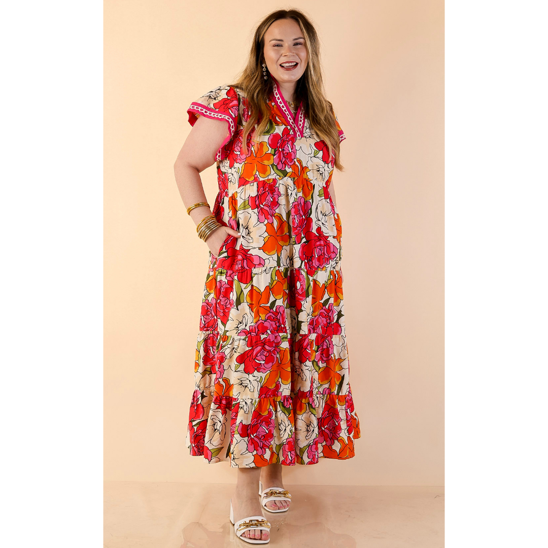 Feminine, vibrant, and effortlessly elegant, the Spring Symphony Floral Print Tiered Midi Dress brings beautiful color and movement to your wardrobe. The soft neutral background is brought to life with bold floral blooms in lively shades of pink and orange, creating a cheerful print that feels perfectly suited for the season.