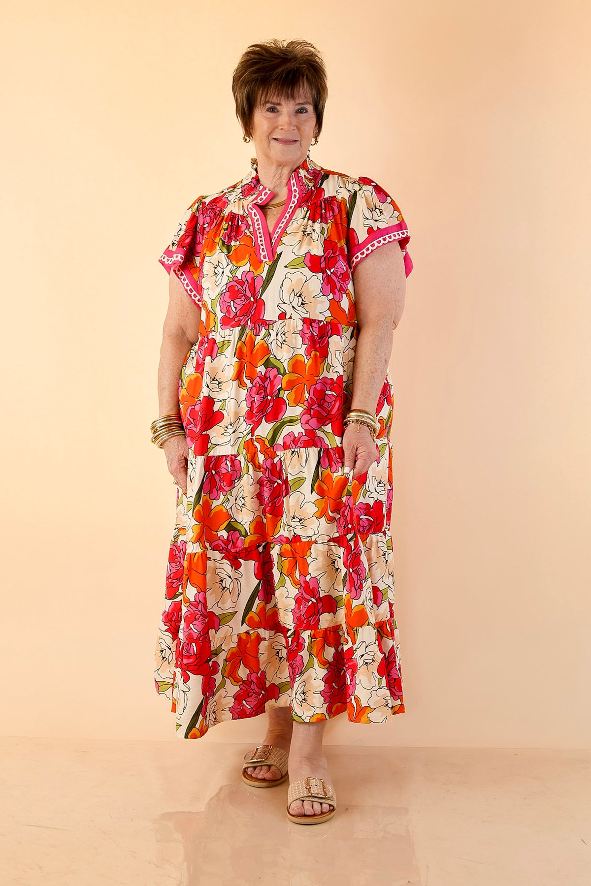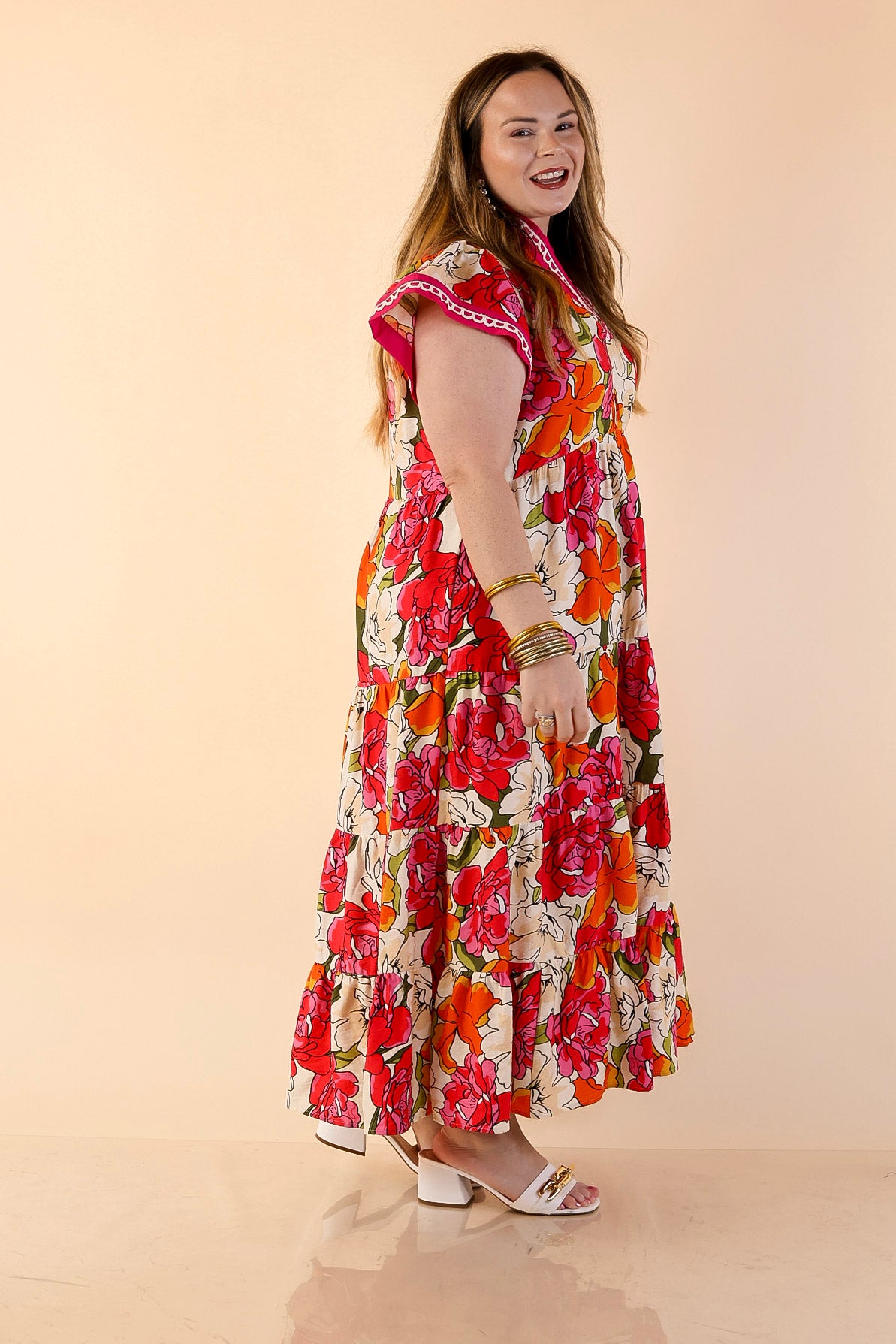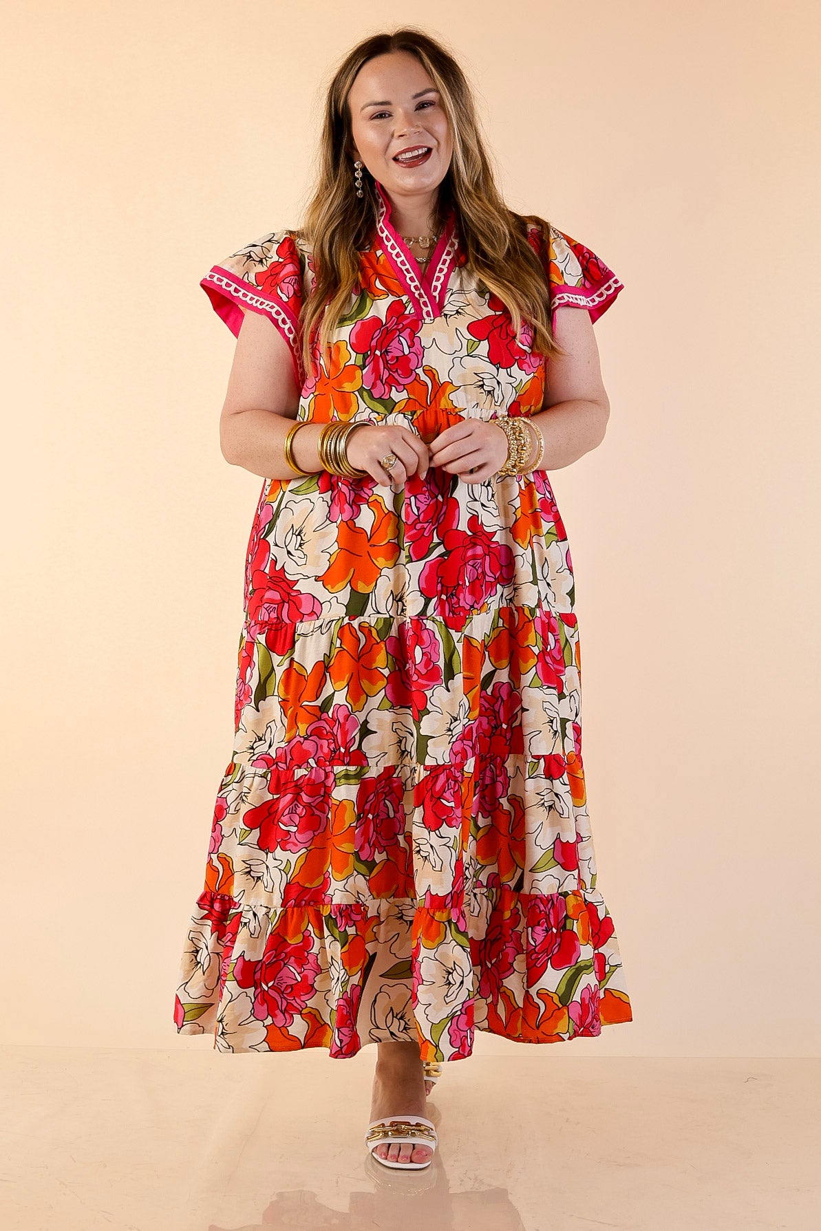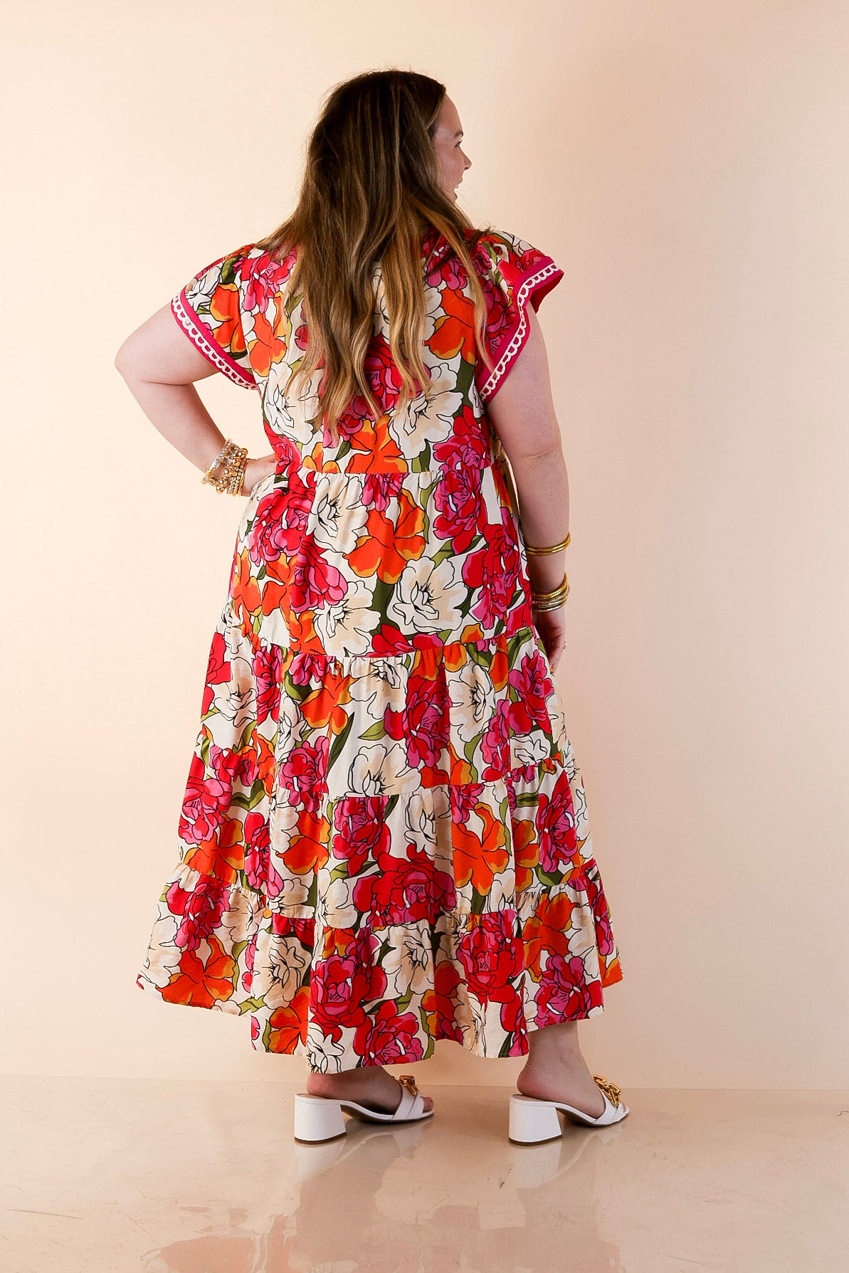 Feminine, vibrant, and effortlessly elegant, the Spring Symphony Floral Print Tiered Midi Dress brings beautiful color and movement to your wardrobe. The soft neutral background is brought to life with bold floral blooms in lively shades of pink and orange, creating a cheerful print that feels perfectly suited for the season.